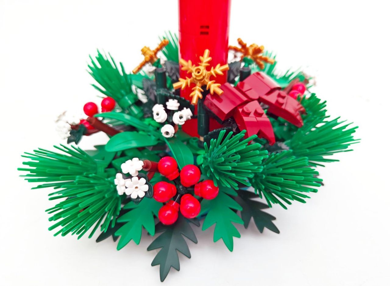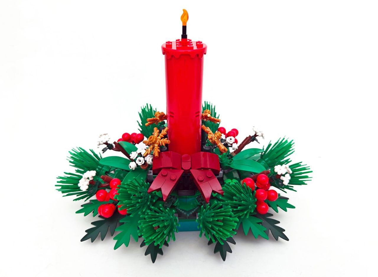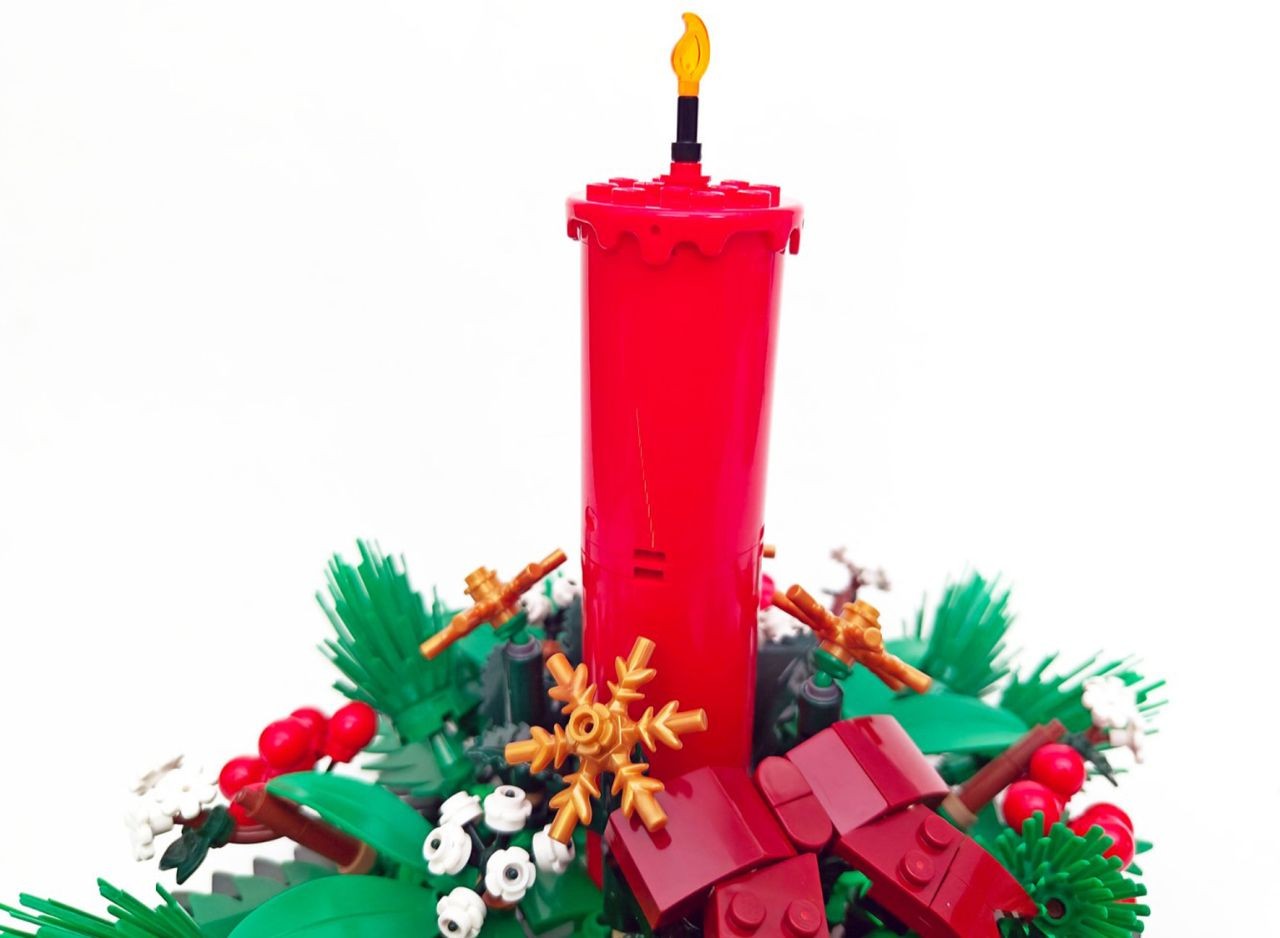 L'ultima fase della costruzione del set è la realizzazione di un grazioso fiocco dark red, realizzato con slope curved e wedge plate, e l'inserimento di 4 stelle dorate intorno alla candela utilizzando il pezzo codice 53972, introdotto nel lontano 2002 in due set della serie Bellville e poi ampiamente usato nel corso degli anni soprattutto come cristallo di ghiaccio. Nella colorazione pearl gold, utilizzata in questo set, fino ad oggi era presente solo nel grande (e costoso) set 43222 del Castello Disney.