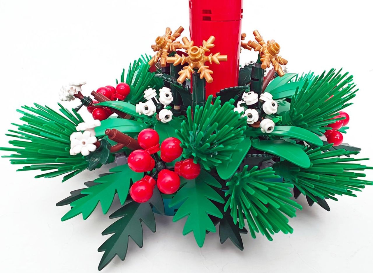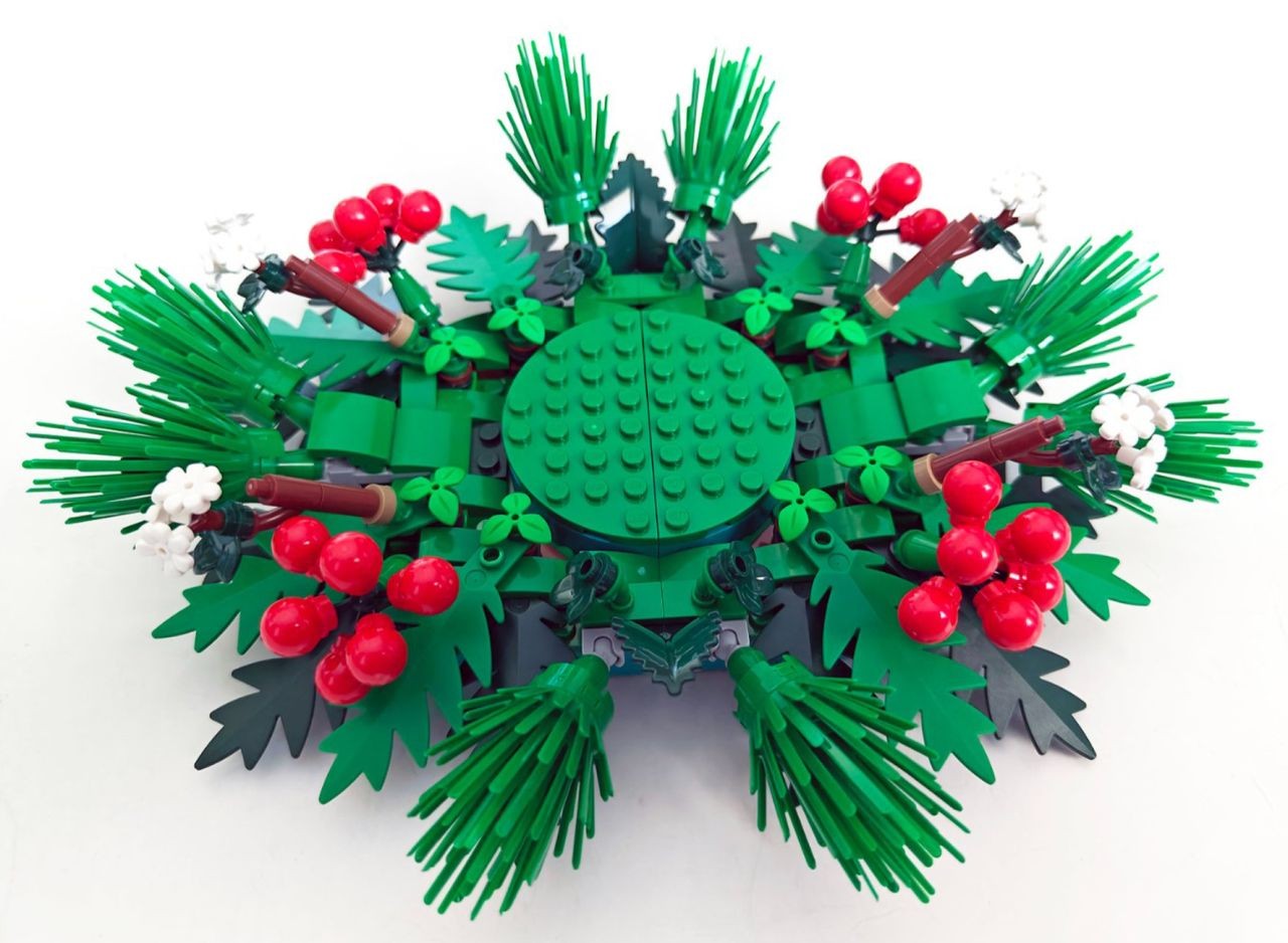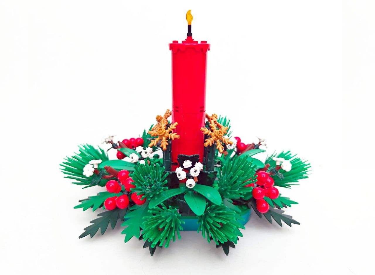 L'ultima fase della costruzione del set è la realizzazione di un grazioso fiocco dark red, realizzato con slope curved e wedge plate, e l'inserimento di 4 stelle dorate intorno alla candela utilizzando il pezzo codice 53972, introdotto nel lontano 2002 in due set della serie Bellville e poi ampiamente usato nel corso degli anni soprattutto come cristallo di ghiaccio. Nella colorazione pearl gold, utilizzata in questo set, fino ad oggi era presente solo nel grande (e costoso) set 43222 del Castello Disney.