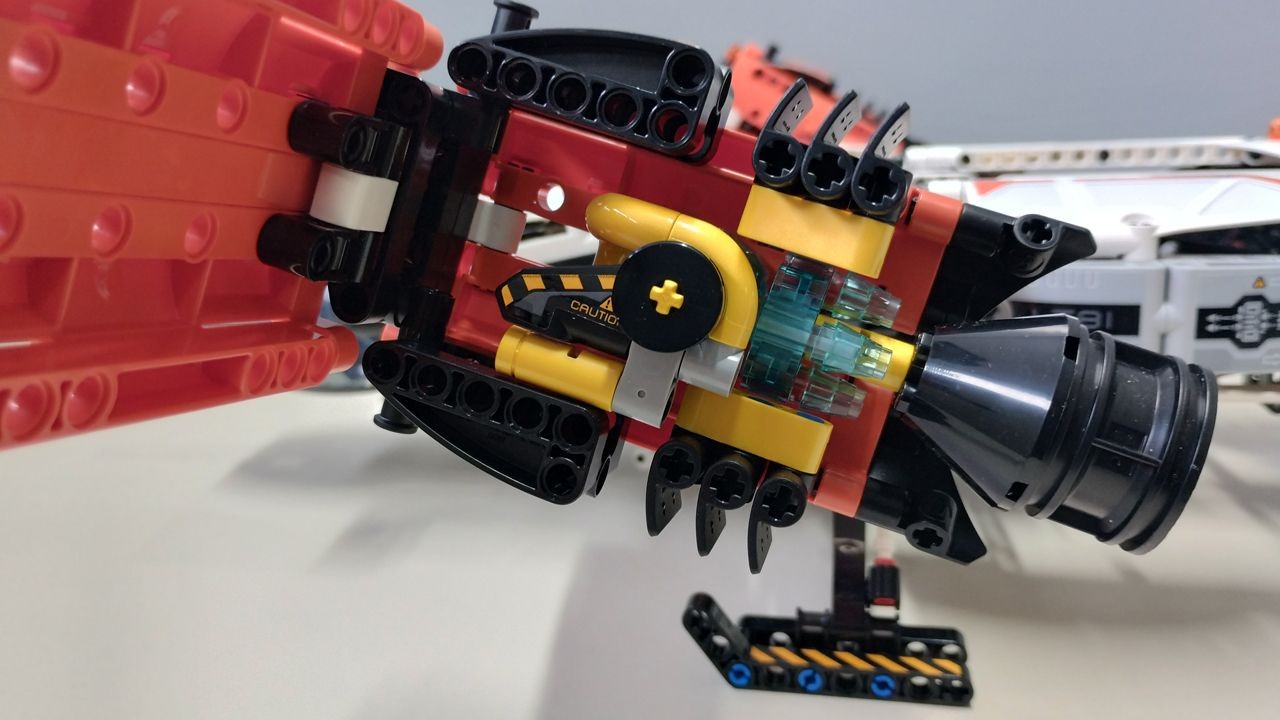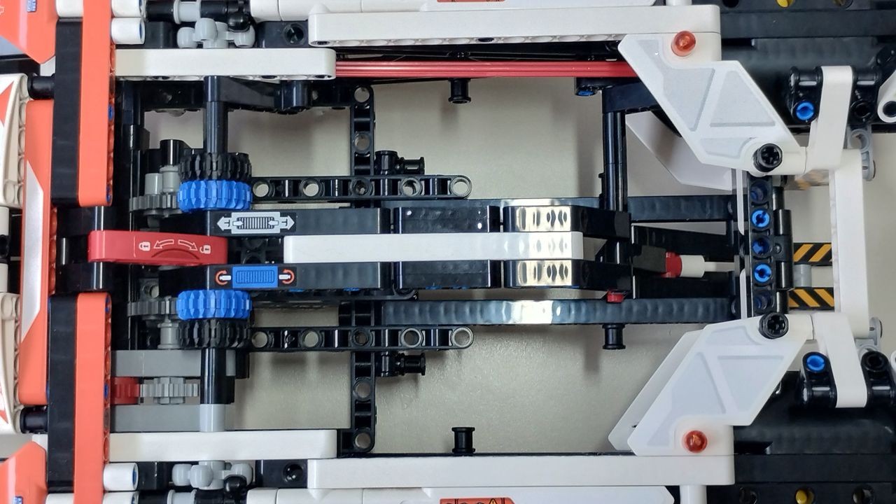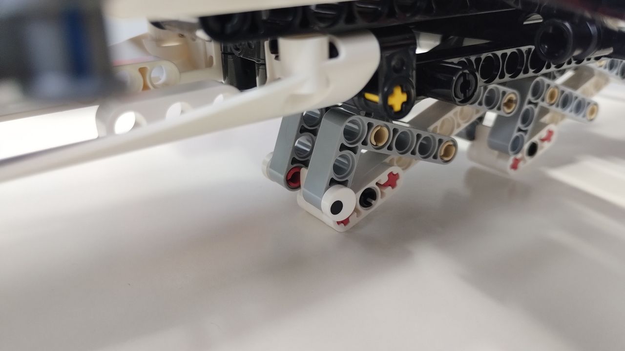 I carrelli di atterraggio si muovono simultaneamente verso l'alto o verso il basso attraverso l'uso di un gear technic nero a 20 denti. Interessante l'introduzione di una nuova tipologia di "knob cog" che ha il foro axle centrale ruotato di 45 gradi rispetto al suo gemello tradizionale. L'utilizzo delle due tipologie, vecchia e nuova, consente il movimento verso l'alto e verso il basso dei carrelli di atterraggio laterali. L'introduzione del nuovo "knob cog" consentirà nuove modalità di realizzazione di ingranaggi senza dover ricorrere alle ruote dentate. Infatti, nell'ultima fase della costruzione, lo stesso meccanismo verrà riutilizzato per le ruote sterzanti del piccolo rover incluso nel set. Il gancio per il sollevamento dei carichi, azionato da una leva a scorrimento, presenta un simpatico dettaglio…due occhi posti a lato dei liftarm che donano un'espressività goliardica al gancio, che sembra un predatore pronto ad azzannare la propria preda…