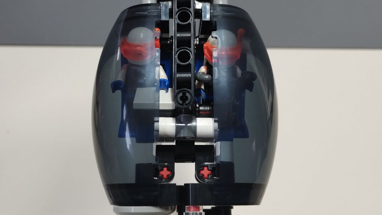 Ormai procediamo spediti verso la fine. Con la busta 9 realizzeremo la cabina di pilotaggio della navicella. Anche qui le sorprese non mancano. La cabina di comando dispone di due postazioni di guida, quella del pilota e quella del copilota/navigatore. Con facilità si riuscirà a farci stare due minifigure tradizionali (cosa rarissima per un set technic), ma c'è un "ma". Nonostante la presenza di ben 46 adesivi, in Danimarca hanno dimenticato di aggiungere uno sticker per il pannello di controllo del copilota, che risulta quindi essere un anonimo tile bianco 2x2… bastava un adesivo o due tile stampati 1x2, tra le decine già in produzione su svariati set, per simulare un bel pannello di comando. Brutto, davvero brutto. Però, e c'è anche un "però", subito dopo questa sorpresaccia passiamo a costruire le due gocce in trans black che conferiscono alla capsula di pilotaggio una bellissima forma, e quando andiamo ad innestare la cabina sull'astronave parte un "ohhh" di meraviglia…la postazione di guida bascula lateralmente all'asse centrale della navicella… In pratica funziona, consentitemi il paragone, "a testa di gufo". Impugnando l'astronave e inclinandola di lato la cabina di pilotaggio resta sempre perpendicolare al suolo. Stupendo (quasi quasi gli perdoniamo quell'anonimo tile bianco 2x2). Completiamo il passaggio 9 con una serie di pannelli (7 pannelli, 5 adesivi) che coprono e raccordano lo chassis dell'astronave con la capsula di pilotaggio.