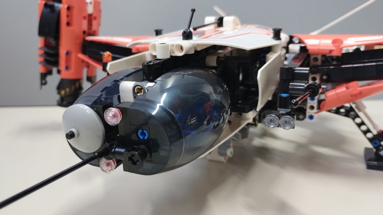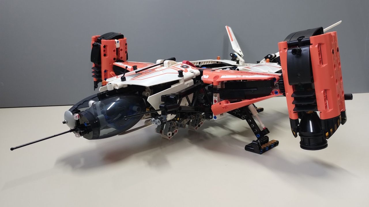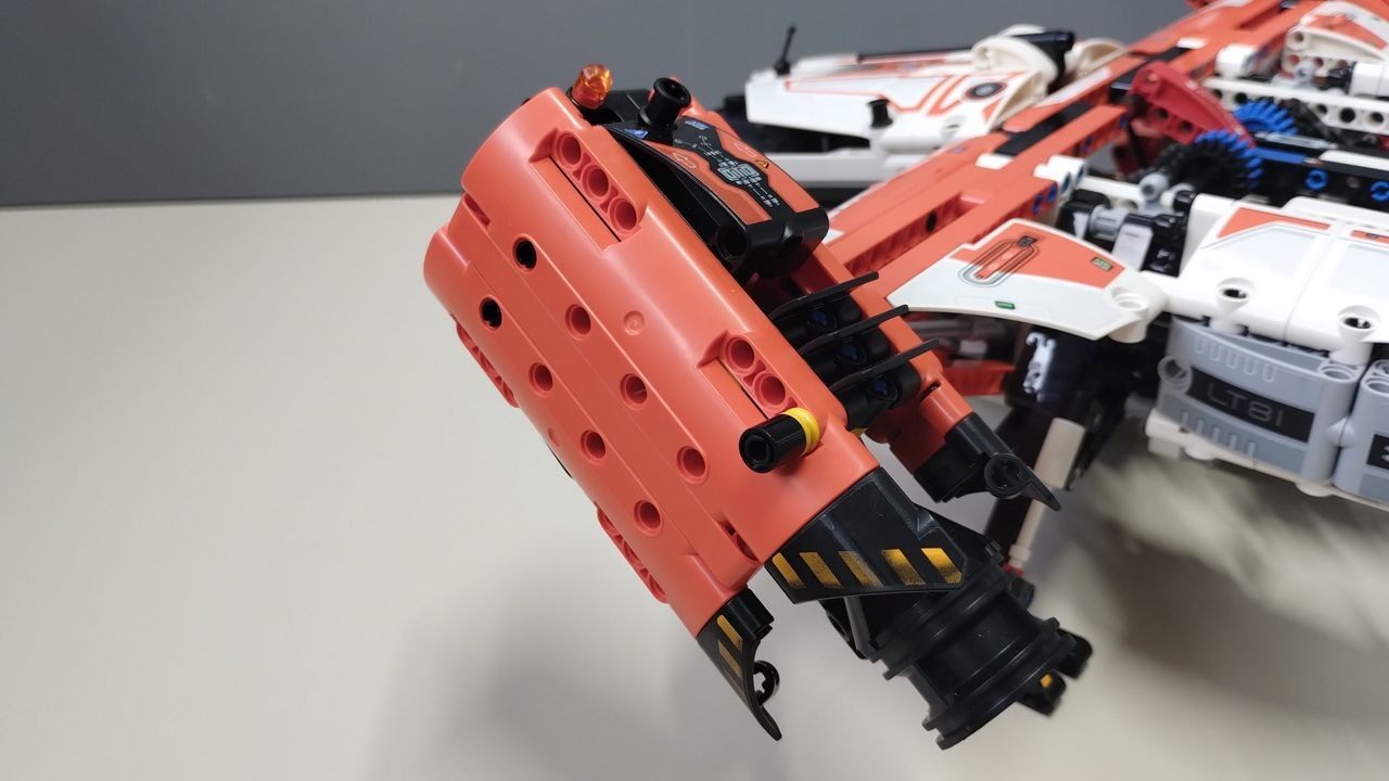 Le funzionalità del set sono tante. Al centro dello chassis sono condensati i comandi principali che azionano il sollevamento/abbassamento dei carrelli di atterraggio attraverso le ruote dentate nere, mentre la rotazione dei motori è ottenuta azionando le ruote dentate blu, poste sullo stesso axle di quelle nere. L'estensione/ritrazione del gancio di sollevamento dei carichi viene attivato facendo pressione sull'unico liftarm rosso (pezzo 80286) presente nel set. Da segnalare il fatto che il meccanismo che attiva il gancio sia esattamente al centro dell'astronave, con le ruote dentate che azionano la rotazione dei motori ed il sollevamento/abbassamento dei carrelli di atterraggio, posti sia a destra che a sinistra del comando del gancio dei carichi, consentendo così il gioco sia ai destrosi che ai mancini. L'astronave risulta facile da impugnare e sollevare. Subito dietro gli ingranaggi principali c'è una comoda maniglia, realizzata con liftarm, per afferrare la navicella. Il peso finale del modello è di circa 1,5 kg. La fascia d'età consigliata per la costruzione è 10+. Nessun passaggio costruttivo risulta particolarmente complesso da seguire e la costruzione fila liscia e scorrevole, fermo restando che le funzionalità, a dispetto della facilità di costruzione, sono notevoli ed affascinanti. La chicca, per me, è la cabina di pilotaggio a "testa di gufo" realizzata a misura di minifigure. Stesso discorso vale anche per gli altri set Technic Space, anch'essi realizzati per ospitare le minifigure classiche… mi aspetto di veder presto MOC e diorami con questi set.