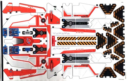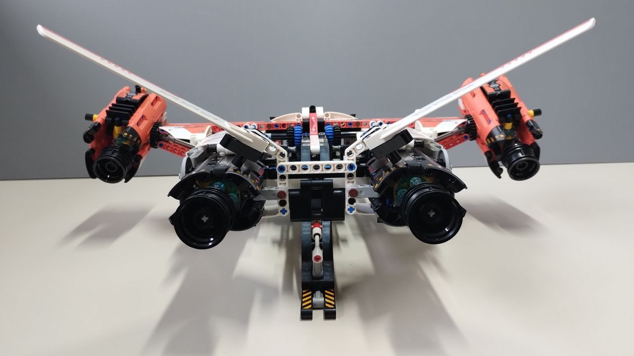 Siamo oltre la metà della costruzione, adesso con le buste 7 e 8 completeremo la costruzione dei motori alari e realizzeremo i timoni di coda. I timoni sono fissi, decorati anch'essi da due adesivi particolarmente lunghi. I motori sono una vera chicca… è possibile aprire i pannelli laterali dei motori stessi (fissati da un semplice ed efficace perno axle) e sarà possibile ammirare dei bellissimi dettagli, come le tubazioni realizzate in giallo, il sistema di propulsione in trans light blue, le prese di sfogo del calore generato dai motori ed i pannelli con adesivo che invitano a "stare attenti". Un vero gioiellino. I motori ruotano azionando il gear technic blu a 20 denti posto al centro dello chassis, affianco all'ingranaggio che comanda i carrelli di atterraggio.