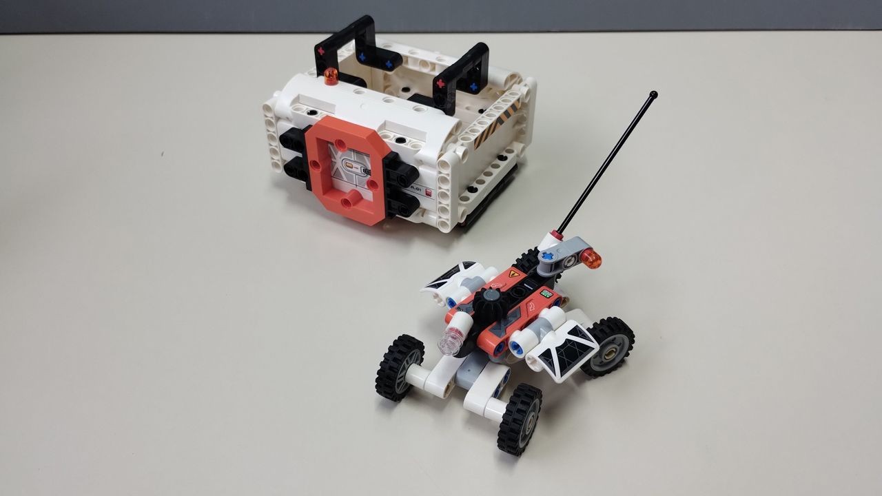 Finita? No, quasi. Nell'ultimo step, busta 10, andremo a costrurie un simpatico rover con ruote sterzanti ed il suo container. Il container è l'elemento incluso nel set che può essere sollevato attraverso il gancio posto sotto la pancia della navicella, ed è l'unica parte del set dove è posizionato il pezzo 49699, la "camera di equilibrio", che consente la connessione ad altri moduli della serie "Space". Anche qui, purtroppo, piccola nota di demerito sul fatto che questo elemento di connessione sia posizionato su un pannello che non si apre, quindi non è che connetta poi così tanto…vabbè. Il rover è molto carino, sfrutta il nuovo ed il vecchio pezzo "knob cog" per far ruotare simultaneamente le ruote anteriori e posteriori, è dotato di un'antenna di comunicazione e di una videocamera frontale.