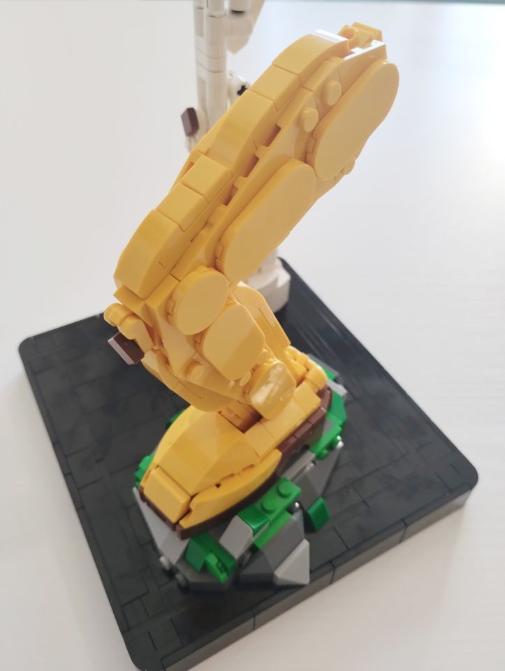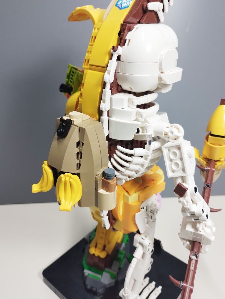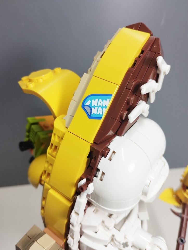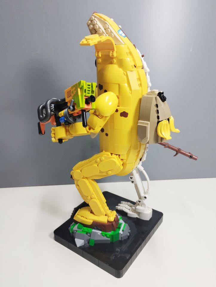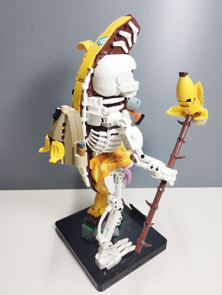 Con le buste da 2 a 6 realizziamo la base/piedistallo e le gambe del nostro Peely. In particolare con al busta 2 costruiamo la parte posteriore del piedistallo e gran parte della gamba scheletrica, quasi interamente realizzata con elementi technic bianchi. Con la busta 3 ci imbattiamo subito in una bella tecnica realizzata con snot e ball joint per posizionare il piede della gamba sinistra con una particolare angolazione rispetto alla base. Attraverso i pezzi contenuti nella busta 4 andiamo a completare il piedistallo e la gamba destra. A questo punto con le buste 5 e 6 costruiamo la gamba sinistra. Si parte subito con tecniche snot per consentire di costruire tutto intorno alle parti centrali di caviglia e coscia, realizzate con brick con stud sui lati e bracket e rivestite di plate, plate wedge e tile round, tutto rigorosamente in giallo con alcuni inserti in reddish brown. Con la busta 6 completiamo anche uno spuntone di roccia su cui poggia il piede sinistro. In questa fase troviamo numerosi elementi ricolorati per il set. Ben 5 item diversi, in bianco, per la sola realizzazione della gamba scheletrica oltre ad altri pezzi per la realizzazione della gamba "bananosa", come ad esempio i plate 1x5 ed i plate corner 3x3 in colore giallo, oltre ai tile 2x2 con doppio taglio curvo negli angoli (pezzo 3396), qui ricolorato per la prima volta in reddish brown.