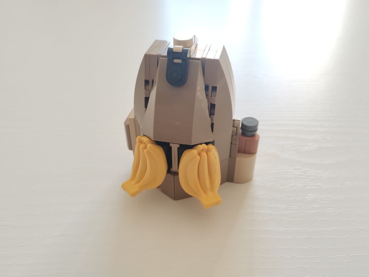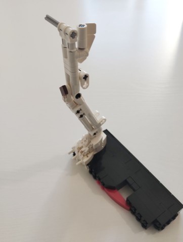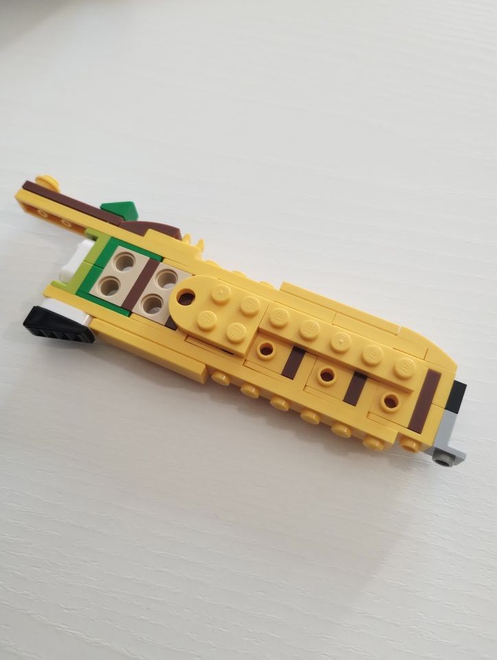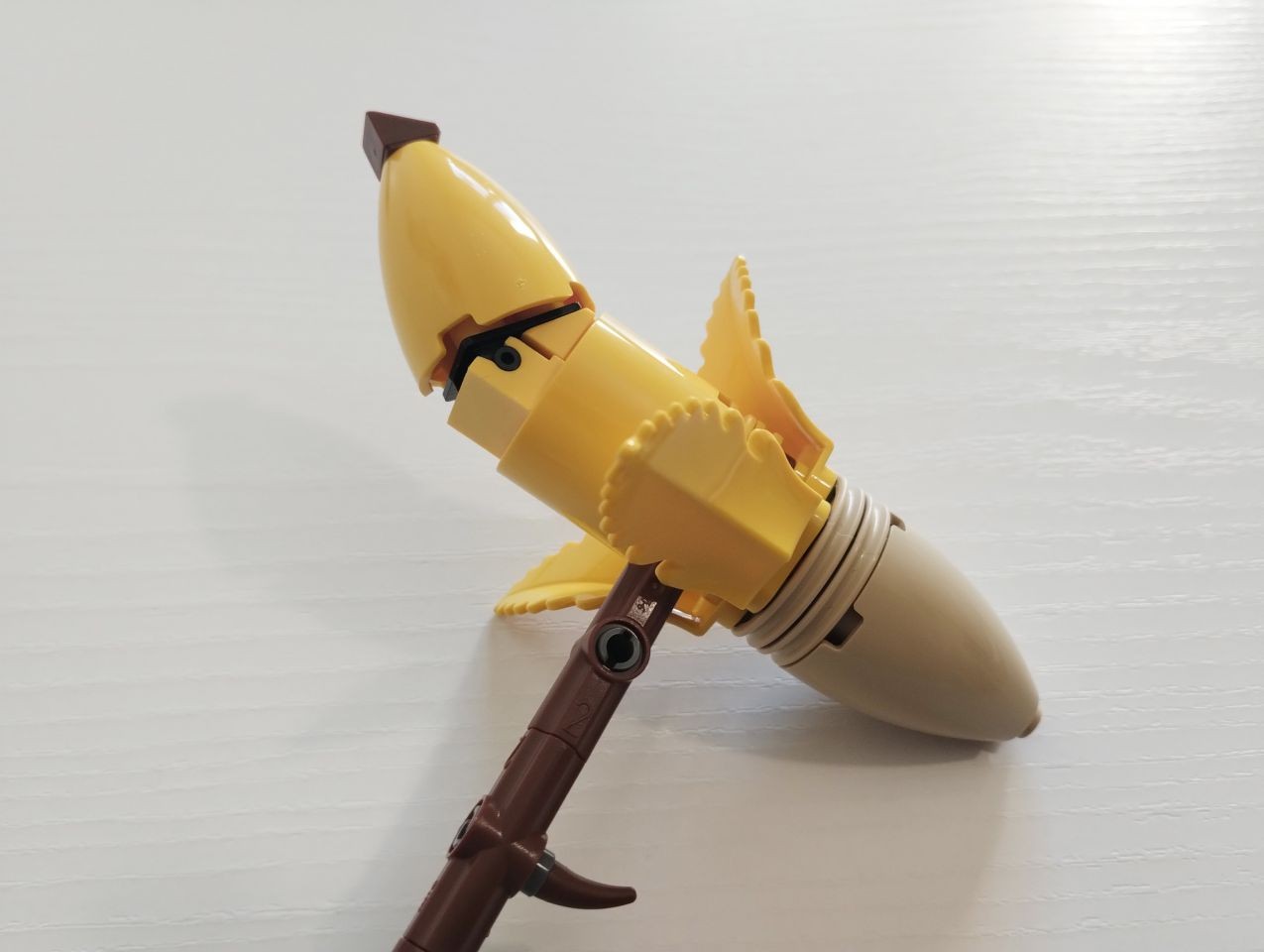 Con le buste da 2 a 6 realizziamo la base/piedistallo e le gambe del nostro Peely. In particolare con al busta 2 costruiamo la parte posteriore del piedistallo e gran parte della gamba scheletrica, quasi interamente realizzata con elementi technic bianchi. Con la busta 3 ci imbattiamo subito in una bella tecnica realizzata con snot e ball joint per posizionare il piede della gamba sinistra con una particolare angolazione rispetto alla base. Attraverso i pezzi contenuti nella busta 4 andiamo a completare il piedistallo e la gamba destra. A questo punto con le buste 5 e 6 costruiamo la gamba sinistra. Si parte subito con tecniche snot per consentire di costruire tutto intorno alle parti centrali di caviglia e coscia, realizzate con brick con stud sui lati e bracket e rivestite di plate, plate wedge e tile round, tutto rigorosamente in giallo con alcuni inserti in reddish brown. Con la busta 6 completiamo anche uno spuntone di roccia su cui poggia il piede sinistro. In questa fase troviamo numerosi elementi ricolorati per il set. Ben 5 item diversi, in bianco, per la sola realizzazione della gamba scheletrica oltre ad altri pezzi per la realizzazione della gamba "bananosa", come ad esempio i plate 1x5 ed i plate corner 3x3 in colore giallo, oltre ai tile 2x2 con doppio taglio curvo negli angoli (pezzo 3396), qui ricolorato per la prima volta in reddish brown.