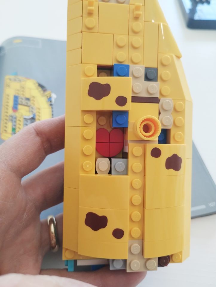 Passiamo alla fase successiva. Busta 7. L'intero sacchetto è dedicato alla costruzione interna del busto di Peely Bone. Si tratta, a tutti gli effetti, di un parallelepipedo di larghezza due stud e lunghezza 6, costruito con brick con stud laterali e bracket. Le uniche variazioni sono l'inserimento trasversale di brick technic per l'articolazione delle braccia e di slope curvi all'altezza della testa (la cui funzione non è ancora chiara, ma ci arriviamo dopo). Questa è sicuramente l'unica parte un po' noiosa della costruzione del modello. Dalla busta 8 iniziamo il rivestimento della parte sinistra del busto, quella in forma di banana. Si inizia subito con una "chicca" molto simpatica. In un'area del rivestimento, che poi verrà nascosta da slope gialli, andiamo a realizzare un cuore rosso con quattro tile round modified da 1x1. Anche le banane hanno un cuore.