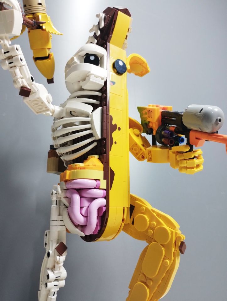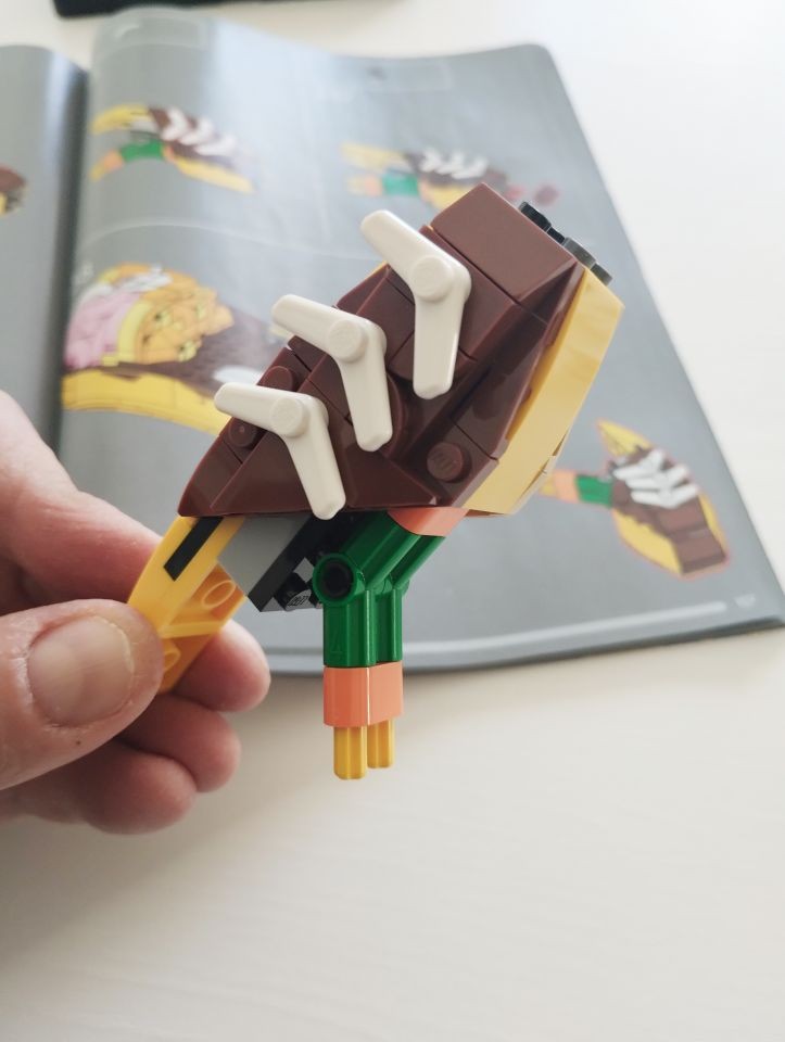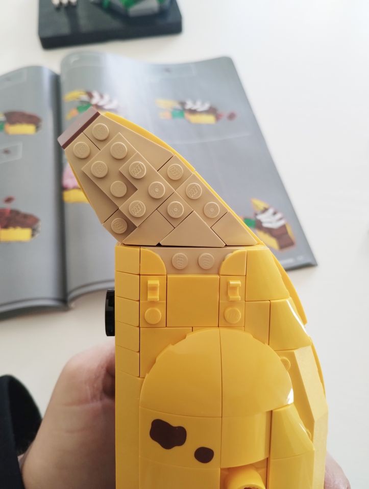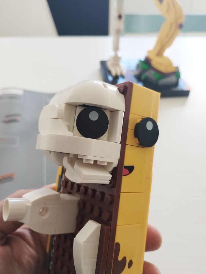 A questo punto passiamo alla busta 9 che serve a realizzate la parte destra della testa, quella in forma di teschio. Ed anche qui c'è un altro simpatico easter egg. La parte interna del teschio è realizzata, tra l'altro, con due brick 1x3 di colore rosa. Le banane non solo hanno un cuore, ma anche un cervello. Nella realizzazione del teschio vi segnalo anche la presenza dei brick round corner 2x2x1 e 2/3 che, in colore bianco, al momento si trova esclusivamente in questo set.