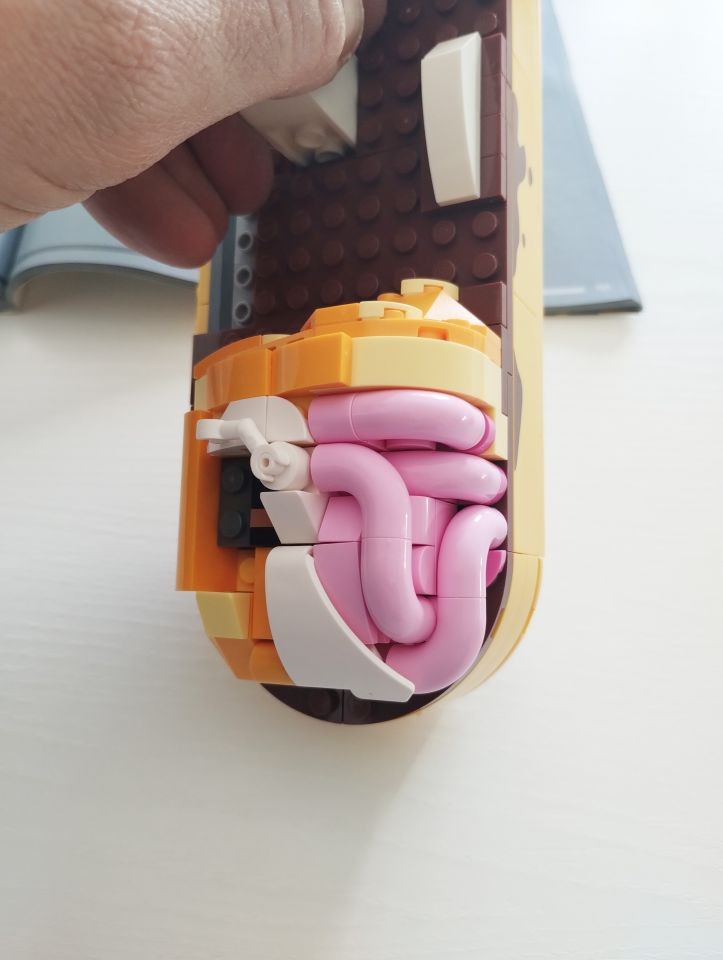 Busta 11. Con i pezzi di questo sacchetto completiamo il rivestimento della parte bassa destra del corpo. Un'alternanza di reddish brown, yellow e bright orange che fanno da contorno alla parte probabilmente più strana ed inquietante del set, ovvero gli intestini perfettamente visibili. Realizzati con brick, slope ed elbow macaroni (pezzo 25214), utilizzando due tonalità di rosa, questa porzione del modello è sicuramente una delle prime cose, se non la prima in assoluto, che salta all'occhio a chiunque si imbatta nel box esposto sugli scaffali dei negozi. Al di là di tutto, anche in questo step l'utilizzo di snot, npu e l'alternanza di colori è riuscitissima.