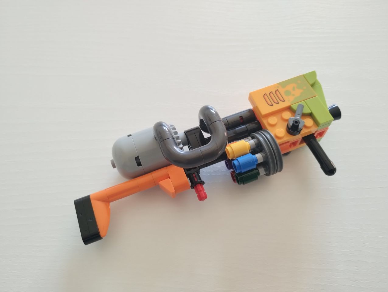 Eccoci all'ultimo sacchetto, il numero 15. Chiudiamo la costruzione del set così come la abbiamo aperta, con la realizzazione di un'arma. Si tratta di una sorta di "super blaster spara vernice" che è una perfetta sintesi in miniatura di tutto quanto costruito fin ora. Tecniche snot, un sapiente uso alternato di pezzi technic, plate, slope, tile stampati e colori vivaci. Il set si conclude con l'applicazione dell'ultimo pezzo stampato, un tile modificato 4x6 con stud su tre bordi, riportante al centro i due loghi di LEGO e Fortnite nella riga superiore e la scritta Peely Bone nella riga inferiore.