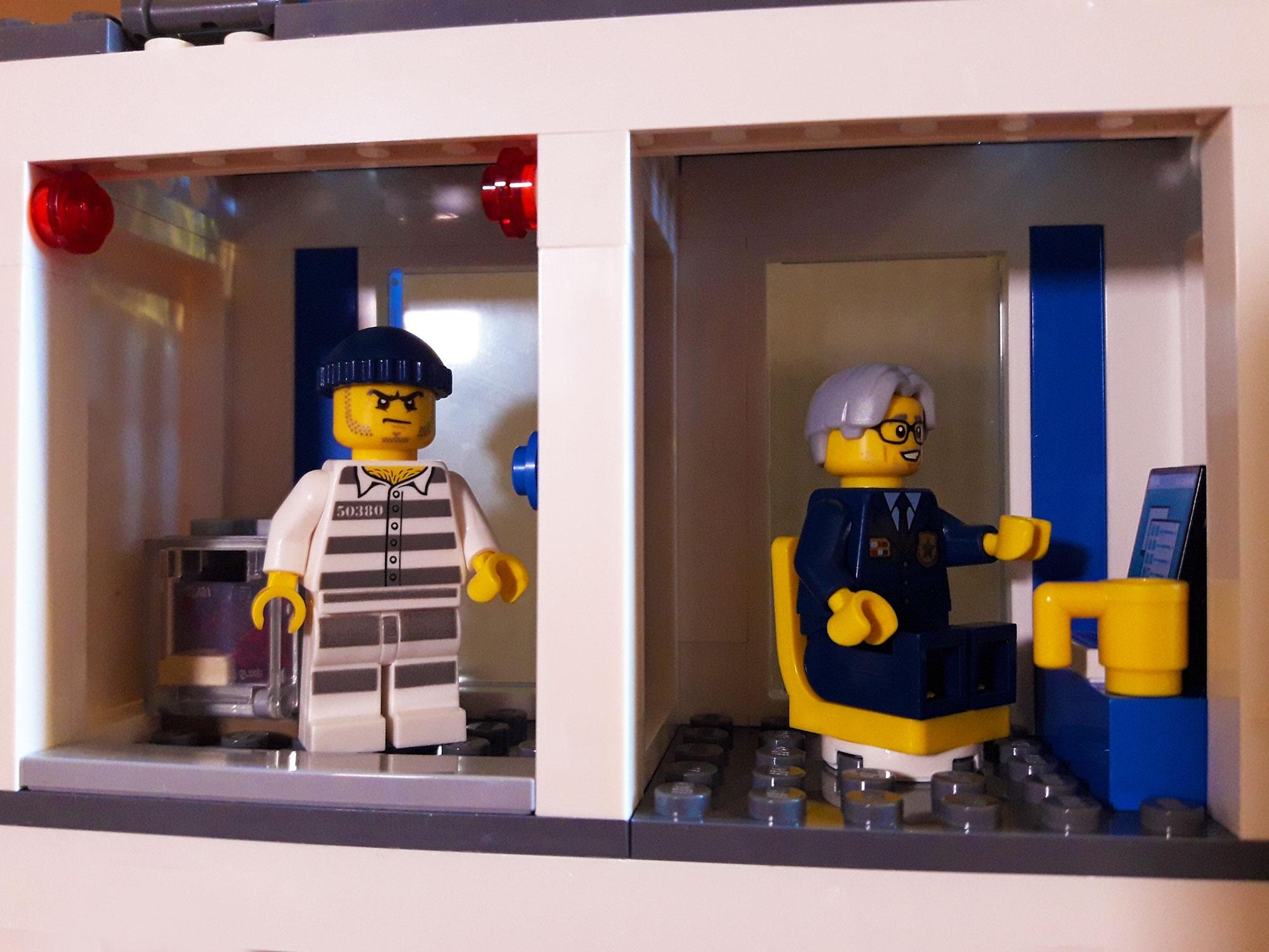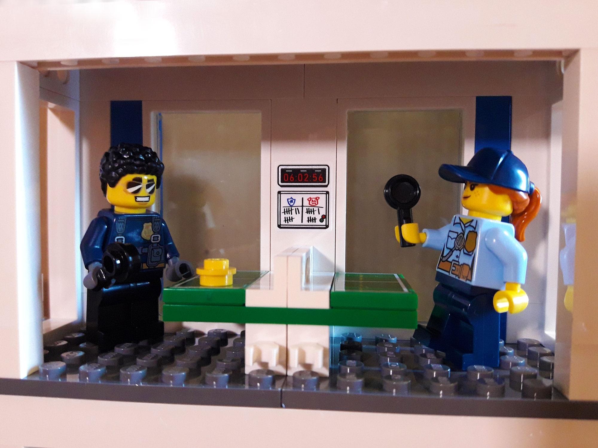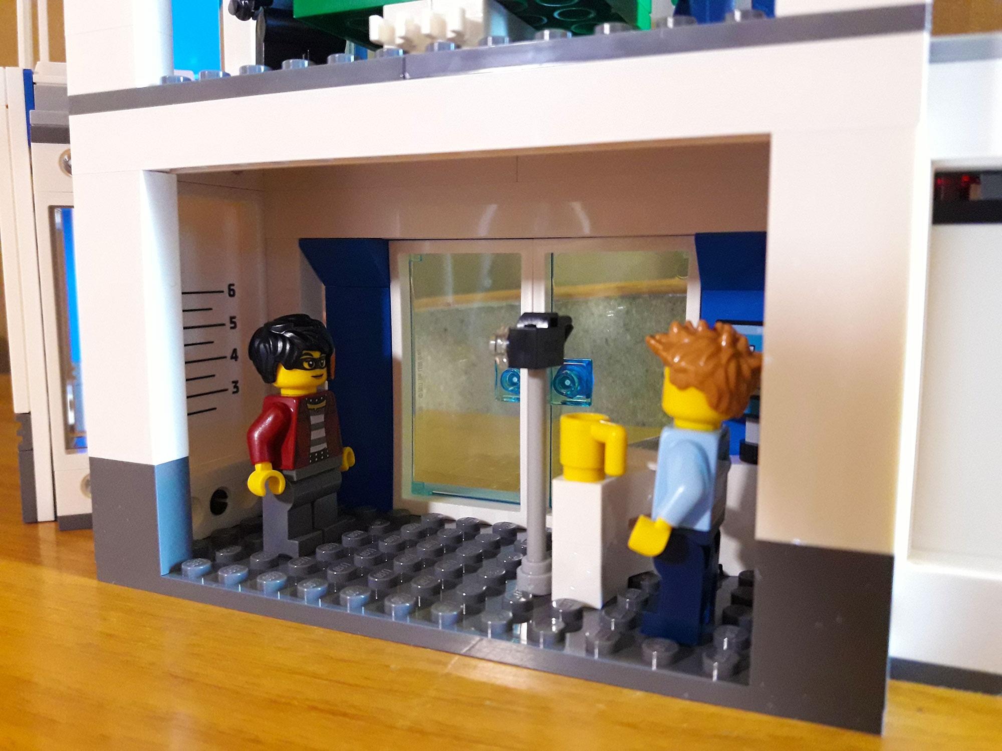 Si passa poi alla costruzione dell’edificio, iniziando dalla parte principale, che comprende: l’ingresso con portineria e postazione per la foto segnaletica a piano terra, al primo piano area relax dei poliziotti con tavolino da ping-pong e infine al secondo piano l’ufficio del capo e la cella con la cassaforte. L’edificio è essenziale e fa molto uso di colonne, vetri e pannelli, forse per facilitare il montaggio e forse anche per contenere i costi; magari poteva essere arricchito di qualche dettaglio nella facciata. Bisogna dire comunque che è modulare, ovvero si può agganciare e sganciare con gli altri edifici e questi si possono intercambiare creando una composizione a proprio piacimento.