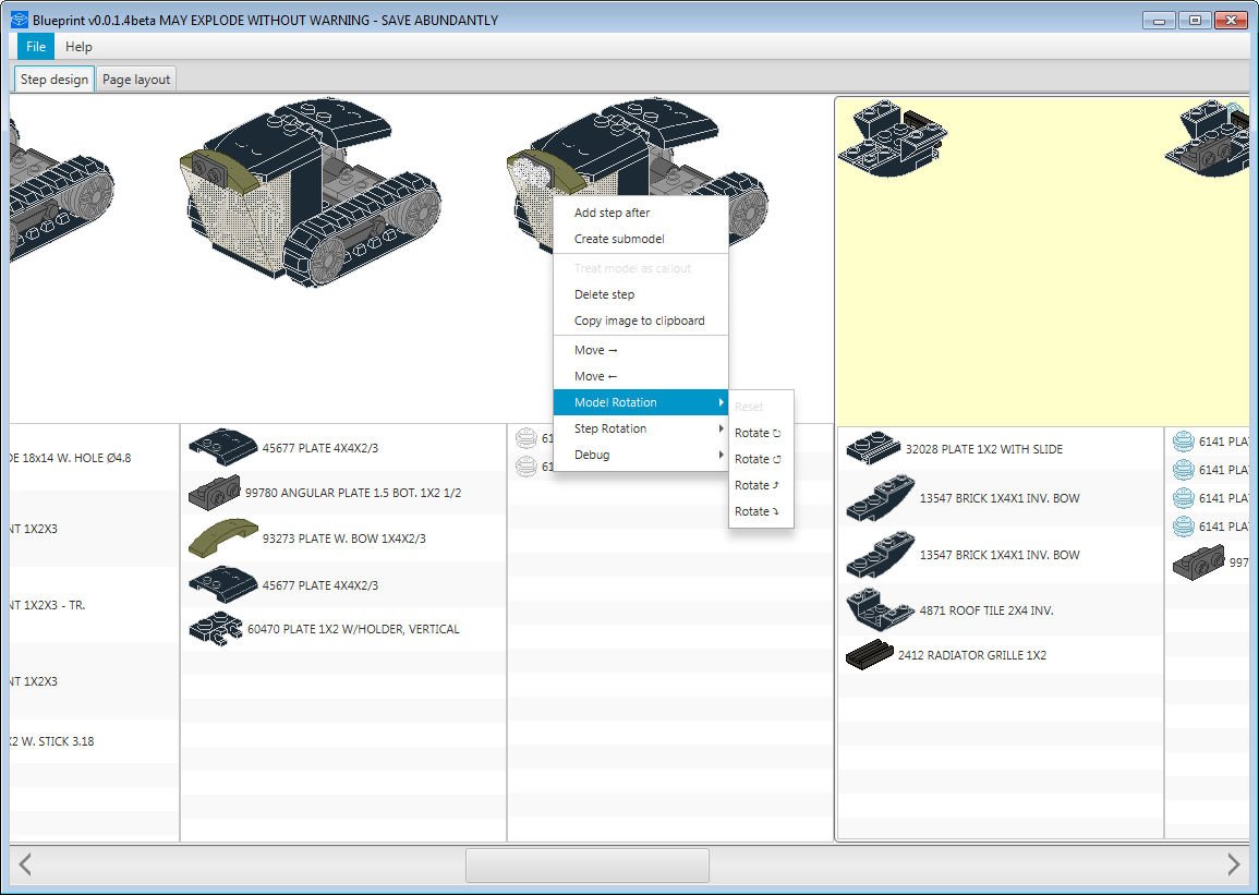 la cui unica limitazione è l'utilizzo cone i file LDD per il resto ecco come funziona: nel programma viene importato un LXF. Il programma genererà una serie predefinita di passi di costruzione (tenendo conto delle definizioni del gruppo LDD). È quindi possibile affinare i passaggi della costruzione spostando le parti, creando passaggi, sottomodelli e didascalie e organizzando il materiale come si preferisce. Una volta terminato, è possibile passare al "layout di pagina" e generare le illustrazioni, che è possibile regolare come si preferisce.Nel programma viene importato un LXF. Il programma genererà una serie predefinita di passi di costruzione (tenendo conto delle definizioni del gruppo LDD). È quindi possibile affinare i passaggi della costruzione spostando le parti, creando passaggi, sottomodelli e didascalie e organizzando il materiale come si preferisce. Una volta terminato, è possibile passare al "layout di pagina" e generare le illustrazioni, che è possibile regolare come si preferisce. (tratto dal sito)