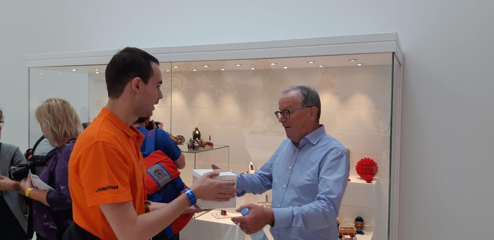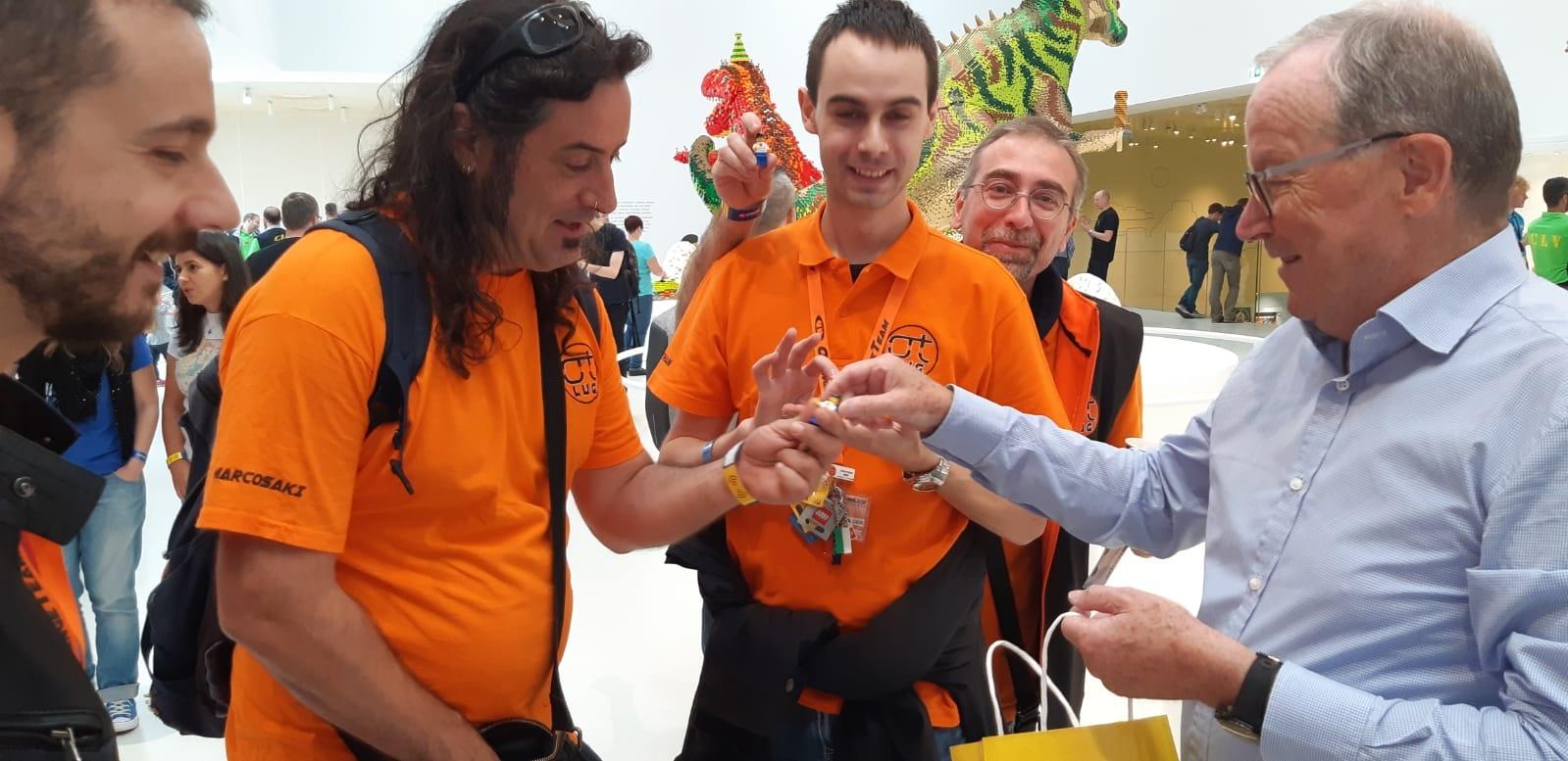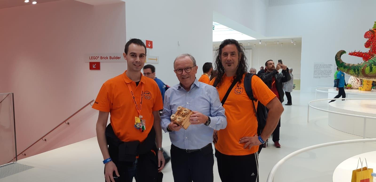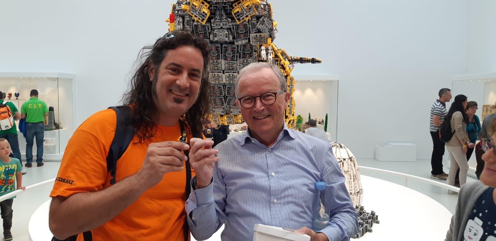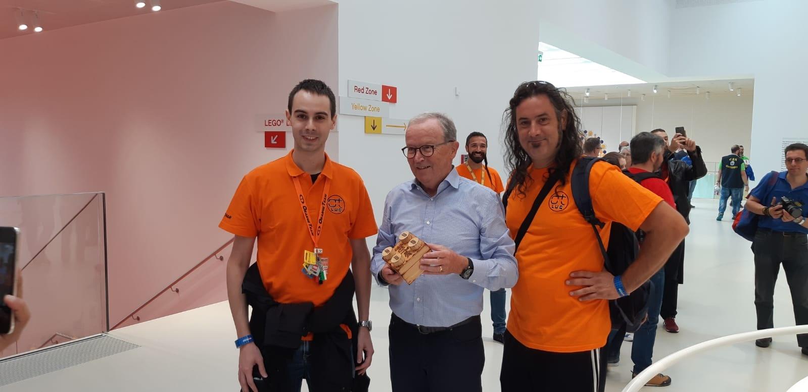 A questo punto non rimaniamo lì ad aspettare e iniziamo ad esplorare la LEGO House: al centro dell'edificio notiamo subito un gigantesco albero alto fino al soffitto, si tratta del "Tree of Creativity" un'opera monumentale da oltre 6 milioni di mattoncini, seguiamo le scale intorno all'albero che portano fino al piano più alto della struttura, arrivati in cima troviamo di nuovo Kjeld e a quel punto gli consegnamo un piccolo presente per lui, un mattoncino contenitore in legno realizzato a mano con all'interno una scultura (una minifig) incisa nella punta della grafite di un LAPIS, ci ringrazia con un sorriso ma vi assicuro che il piacere è tutto nostro, la foto è d'obbligo, lo salutiamo di nuovo e lo ringraziamo per tutto quello che ha realizzato.