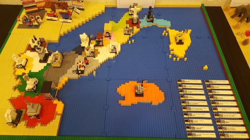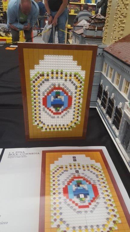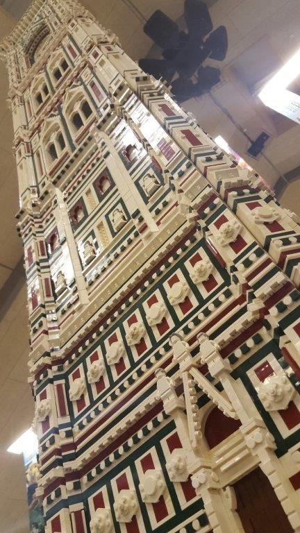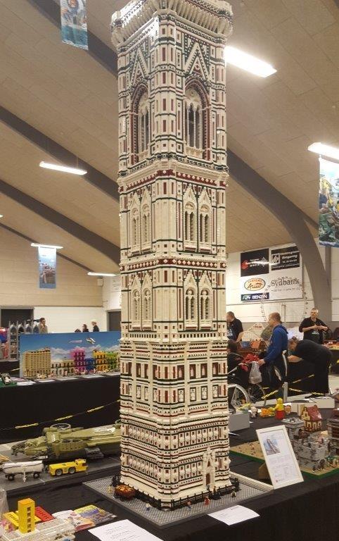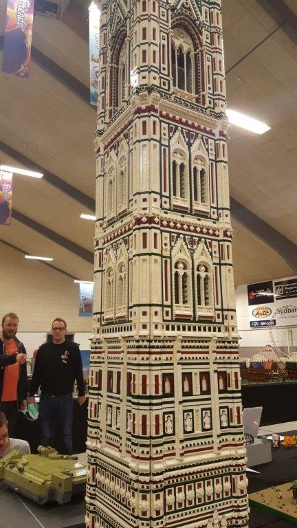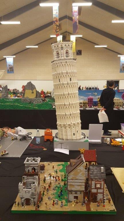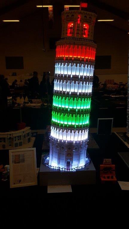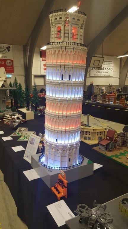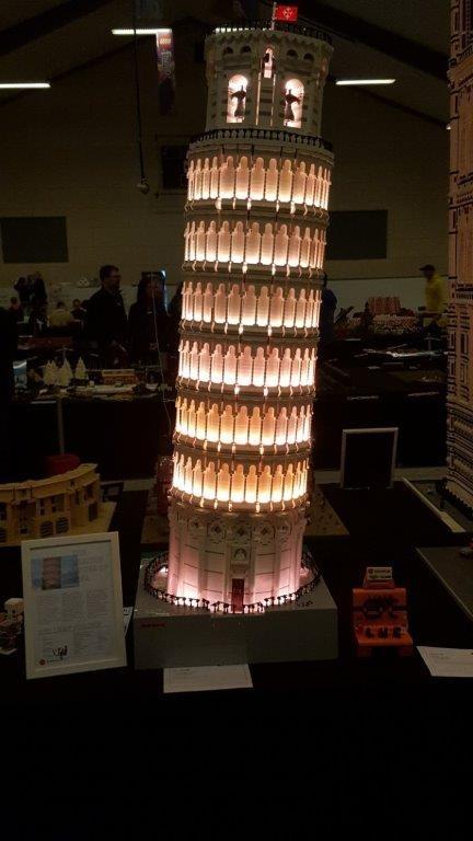 Nel tardo pomeriggio, chiusa al pubblico la manifestazione e come di consuetudine, l'illuminazione delle palestre viene attenuata e ci possiamo godere per oltre 40 minuti la DARK HOUR, una oretta circa di scarsa illuminazione che ci permette di vedere le opere con la propria illuminazione. Non ci resta che goderci la nostra fantastica TORRE DI PISA in mattoncini con i colori della bandiera Danese e Italiana.