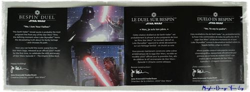 Questa scena appare sia nel set LEGO® STAR WARS™ 10123 CLOUD CITY™ sia nel set LEGO® STAR WARS™ 75222 BETRAYAL AT CLOUD CITY™, ma qui la precisione dei dettagli è decisamente maggiore; nelle due versioni precedenti era una scena parte di un set, in questo caso il design si concentra solo su questo momento e ciò porta ad un'accuratezza decisamente significativa.