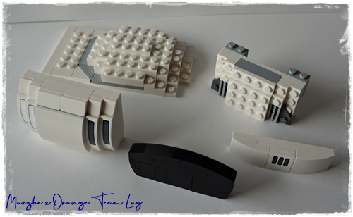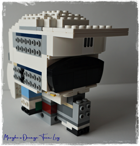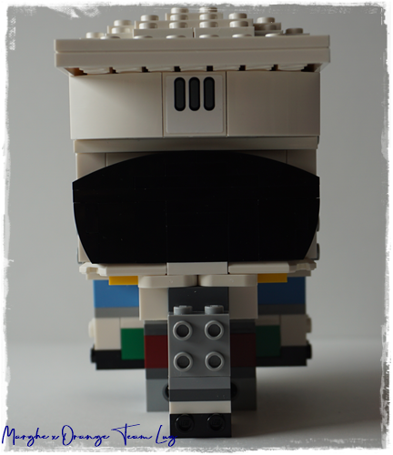Molto interessante la costruzione della visiera: costruita utilizzando gli slope curved che le danno la sagomatura, è leggermente più spigolosa rispetto all'originale, ma penso non sia stato facile replicare la curvatura necessaria su un pezzo comunque piccolo.