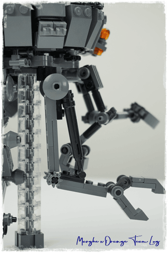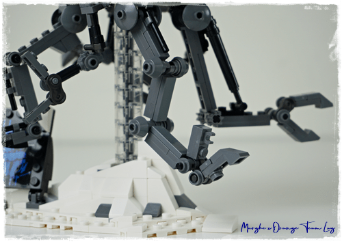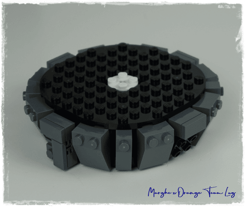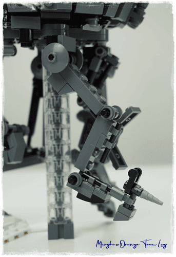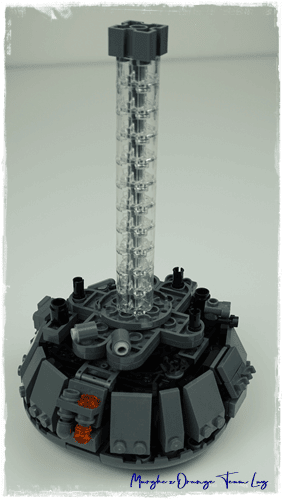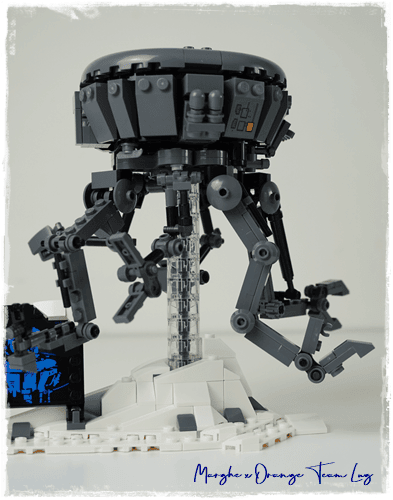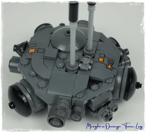 Il supporto, ricreato con brick round 2x2 Trans-Clear e ben nascosto fra i tentacoli della sonda, permette di apprezzare il suo movimento fluttuante e il dettaglio delle sue appendici munite di sensori, strumenti di ricerca e punti di ancoraggio; appendici che possono essere posizionate in modi diversi, allargate o infilate sotto il corpo della sonda.