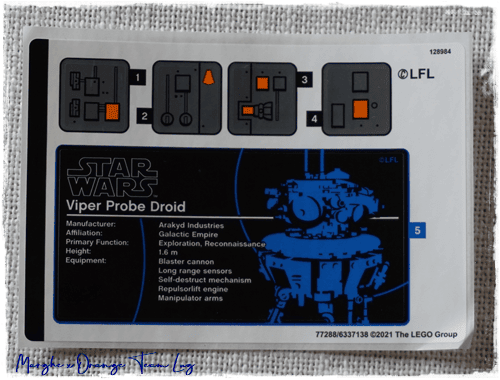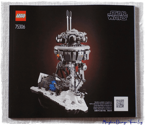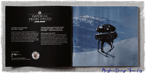 Il libretto delle istruzioni del set LEGO® STAR WARS™ 75306 IMPERIAL PROBE DROID™ questa volta, differentemente da altri della serie 18+, hanno solo la copertina nera e lucida, mentre la parte interna è tornata finalmente in un meglio leggibile grigio; come sempre una nota introduttiva al set di Jens Kronvold Frederiksen, Creative Director LEGO® STAR WARS™.