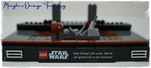 Durante la costruzione del secondo sacchetto posizioneremo anche le targhette di riconoscimento con il logo LEGO® STAR WARS™ e la famosa frase "One thing's for sure. We're all gonna be a lot thinner!" Una cosa è certa. Diverremo tutti magrissimi!