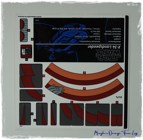 Contiene 18 adesivi ed il vetro del landspeeder - elemento nuovo di zecca creato appositamente per questo set - è fortunatamente, e direi finalmente, contenuto in una confezione separata, protetto da un foglio di spessa plastica adesiva.