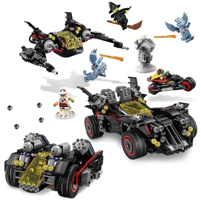 In questo set abbiamo invece un gruppo di veicoli che si possono usare separati o unire in un unico modello. C'è infatti la Batmobile, in stile buggy ma più massiccia, con 4 lanciatori di proiettili e le ali sul retro, alla quale si può agganciare il Bat-Tank sul retro, con due mitragliatrici e due missili. Nella parte superiore si aggancia il Bat-aereo, con altri lanciatori di proiettili e ali pieghevoli. Infine c'è il Bat-ciclo, con le ruote che si possono piegare per inserirlo all'interno del modello.