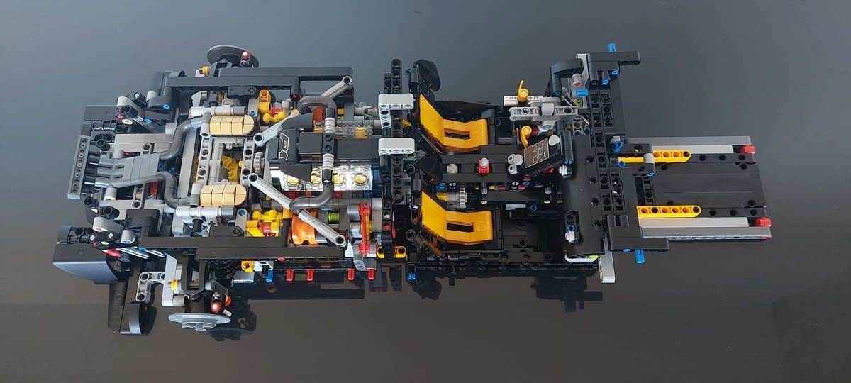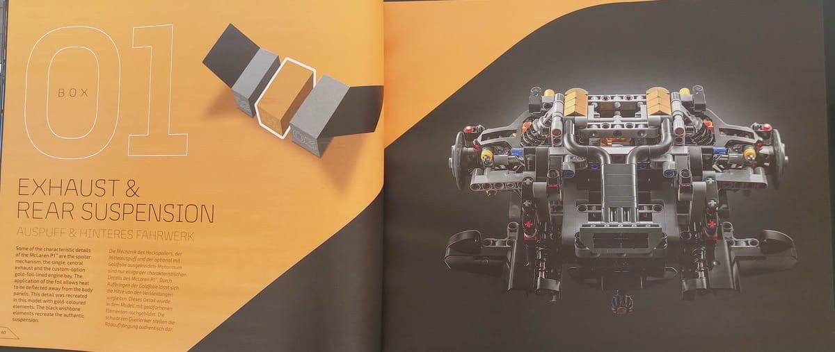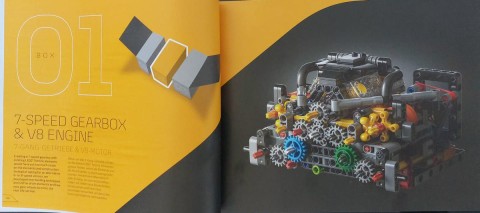 La costruzione del modello procederà di pari passo con l'apertura dei vari sacchetti, inizieremo quindi assemblando l'asse posteriore e l'enorme sistema di scarico, il motore V8 a benzina con il cambio a sette rapporti sequenziali oltre ai sedili e parte dell'abitacolo, una volta finita la scatola avremo la parte meccanica posteriore dell'auto.