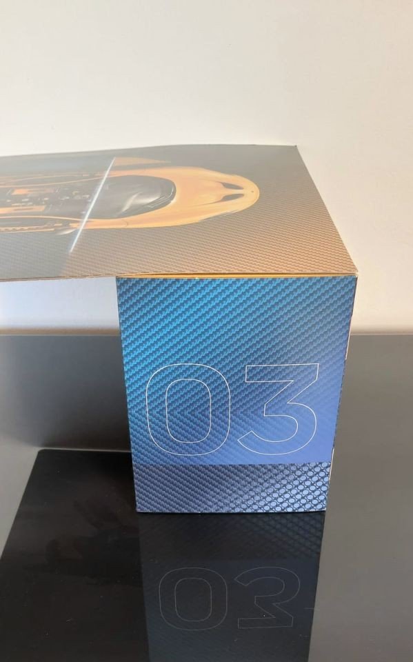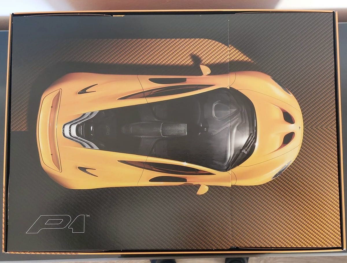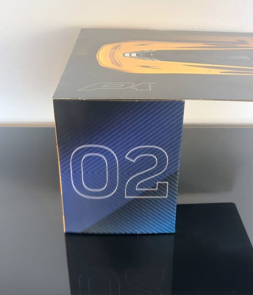 A differenza delle ultime auto della stessa linea, la scatola quest'anno, pur essendo di fattura più pregiata rispetto ai set più commerciali, è molto minimale. Sul davanti, su uno sfondo nero, abbiamo raffigurato il modello posto al centro con una vista di 3/4 sull'anteriore. Sul retro invece rappresentato in ombra c'è la parte posteriore del veicolo con le sue caratteristiche luci. I loghi P1 presenti sia sul davanti che sul retro sono in rilievo, così come il modello della vettura.