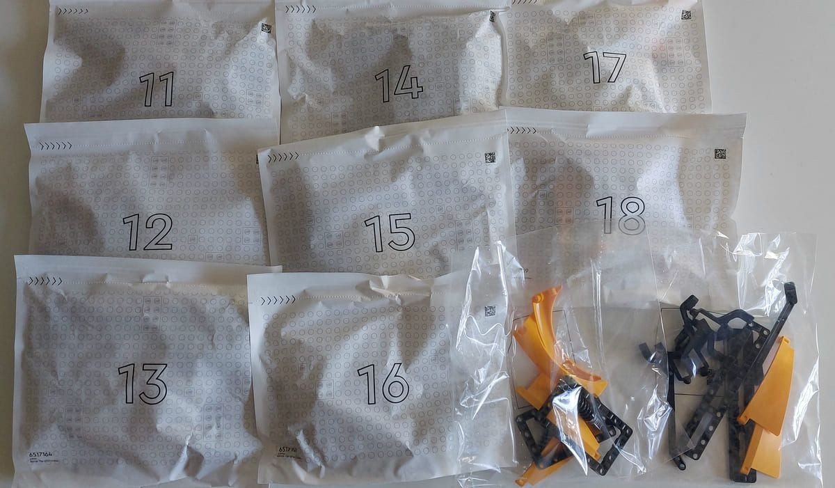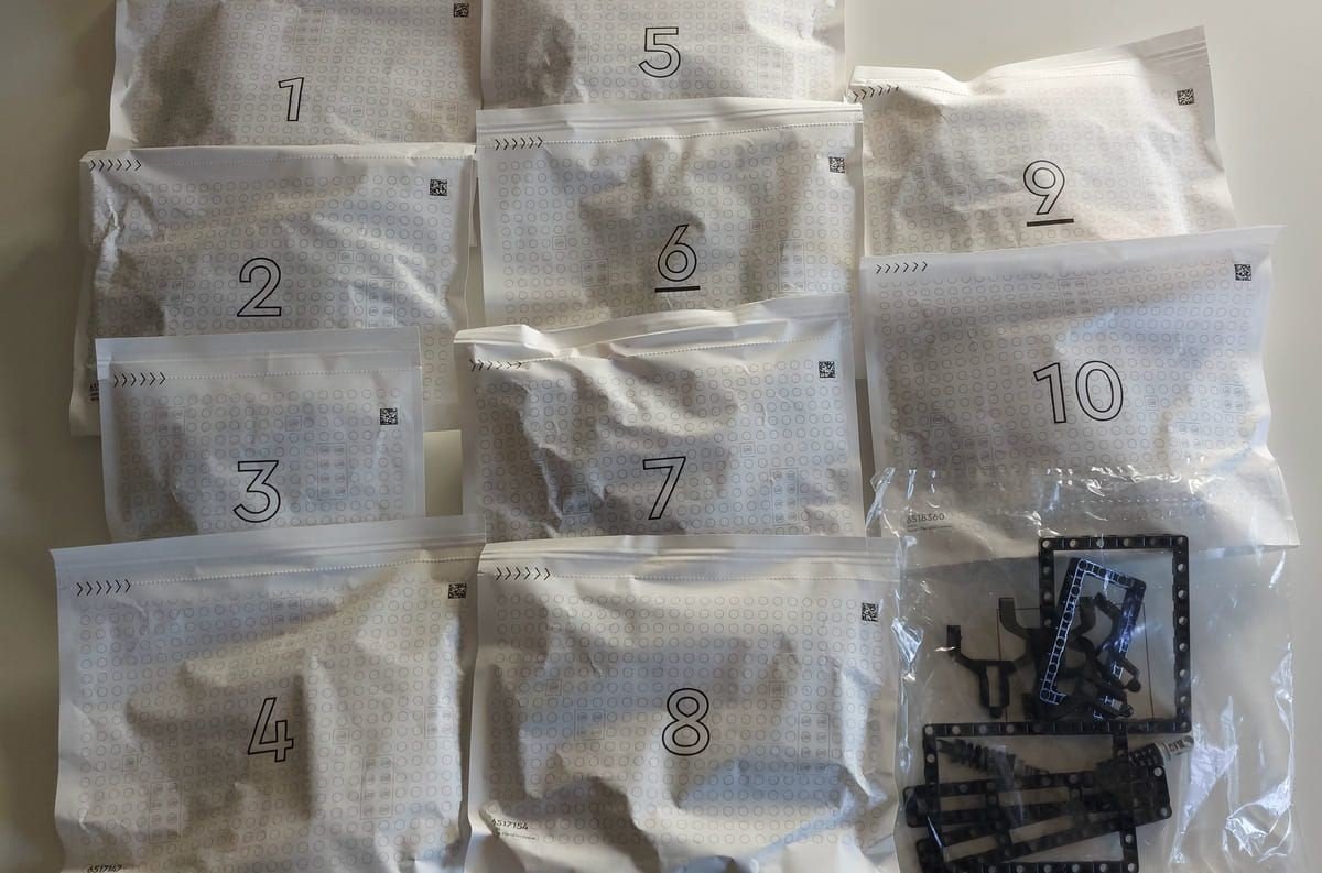 Aprendo la scatola numero 1 troviamo i primi sacchetti: 11 in totale, di cui 10 contrassegnati con numeri e 1 di pezzi sfusi.