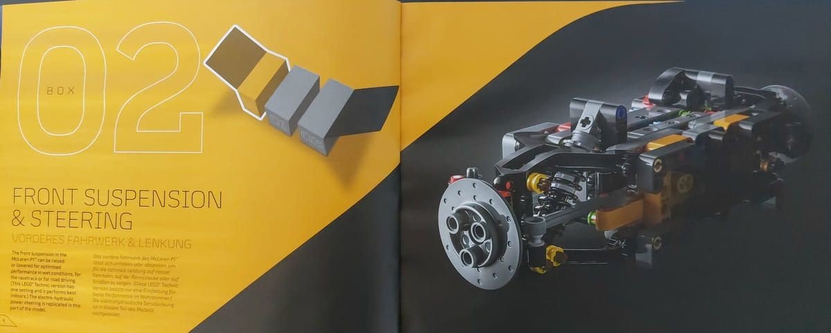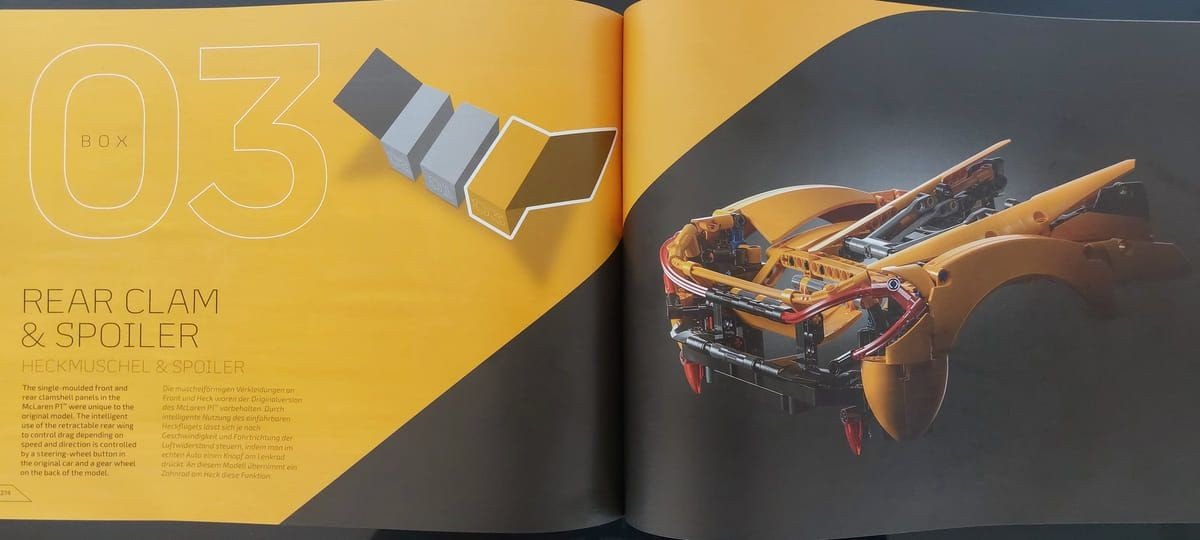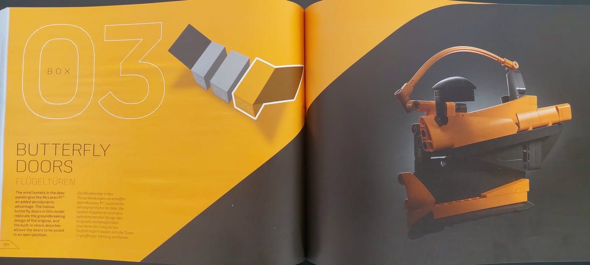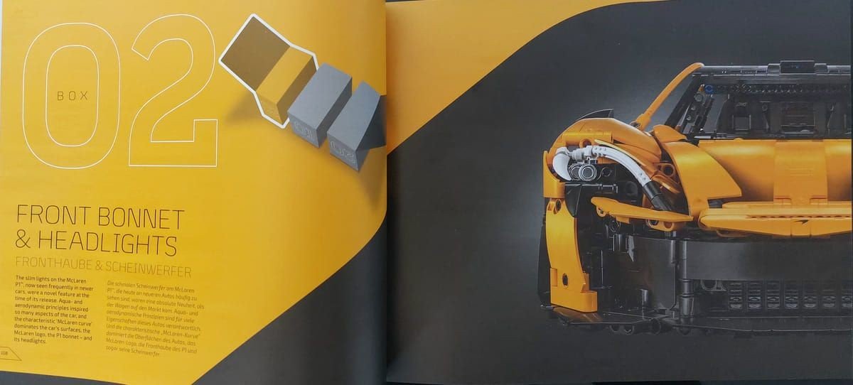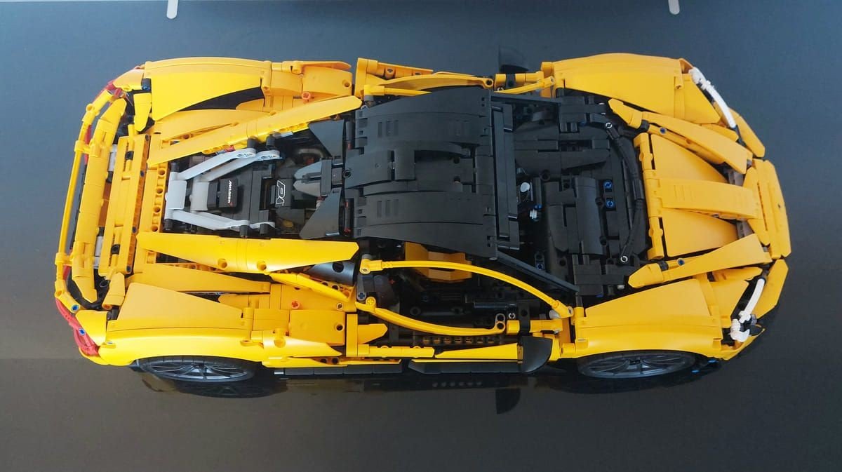 Questo è il quinto modello della serie dedicata alle super car e se avete la fortuna di avere le precedenti potrete vedere la cura nei dettagli presenti in questo. Il set è davvero ben riuscito, il colore Volcano Yellow è ben rappresentato, però non è solo bello da vedere ma è stato bello da montare; interessante il meccanismo di apertura delle porte e l'elemento che va a coprire la parte posteriore dell'auto, che è possibile rimuovere per mostrare il motore e il cambio. Grazie ad alcuni elementi già visti nel set precedente, la Ferrari Daytona SP3, è stato possibile realizzare le linee morbide della P1. Unico neo, ma il set non è pensato per il gioco ma per essere esposto, è l'apertura a farfalla delle porte; queste vanno accompagnate in quanto il Soft Hose che ricrea la parte curva della portiera si incastra con il Panel del tetto e anche in fase di chiusura va riallineata nel suo alloggio, ma appunto è un difetto molto trascurabile. Inizialmente ero dubbioso sulla scelta da parte di Lego® sul modello dell'auto: come avete letto la P1 è uscita di produzione del 2015 e tante altre auto sono state prodotte nel frattempo dalla casa, ultima ad esempio la W1 che è la diretta erede ma, leggendo poi la storia presente sul manuale, la P1 è stata la prima super car ibrida, credo quindi che la scelta sia stata proprio rendere omaggio a questo modello innovativo, a mio avviso ci sono riusciti egregiamente.