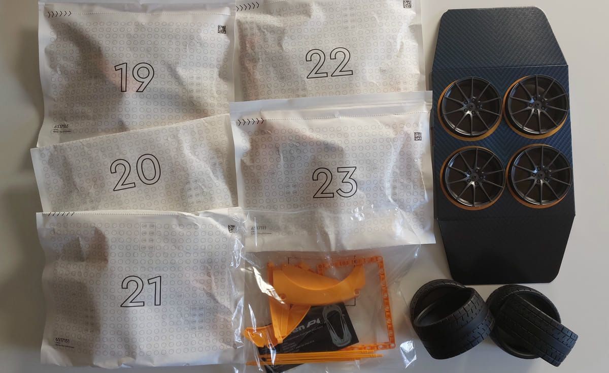 L'ultima scatola contiene 6 sacchetti, 5 numerati e 1 no che contiene tra i vari pezzi la targhetta in stile UCS con i dati del veicolo originale come avvenuto con la Ferrari Daytona SP3 con cui condivide anche i quattro pneumatici oltre ai quattro cerchioni di colore nero.