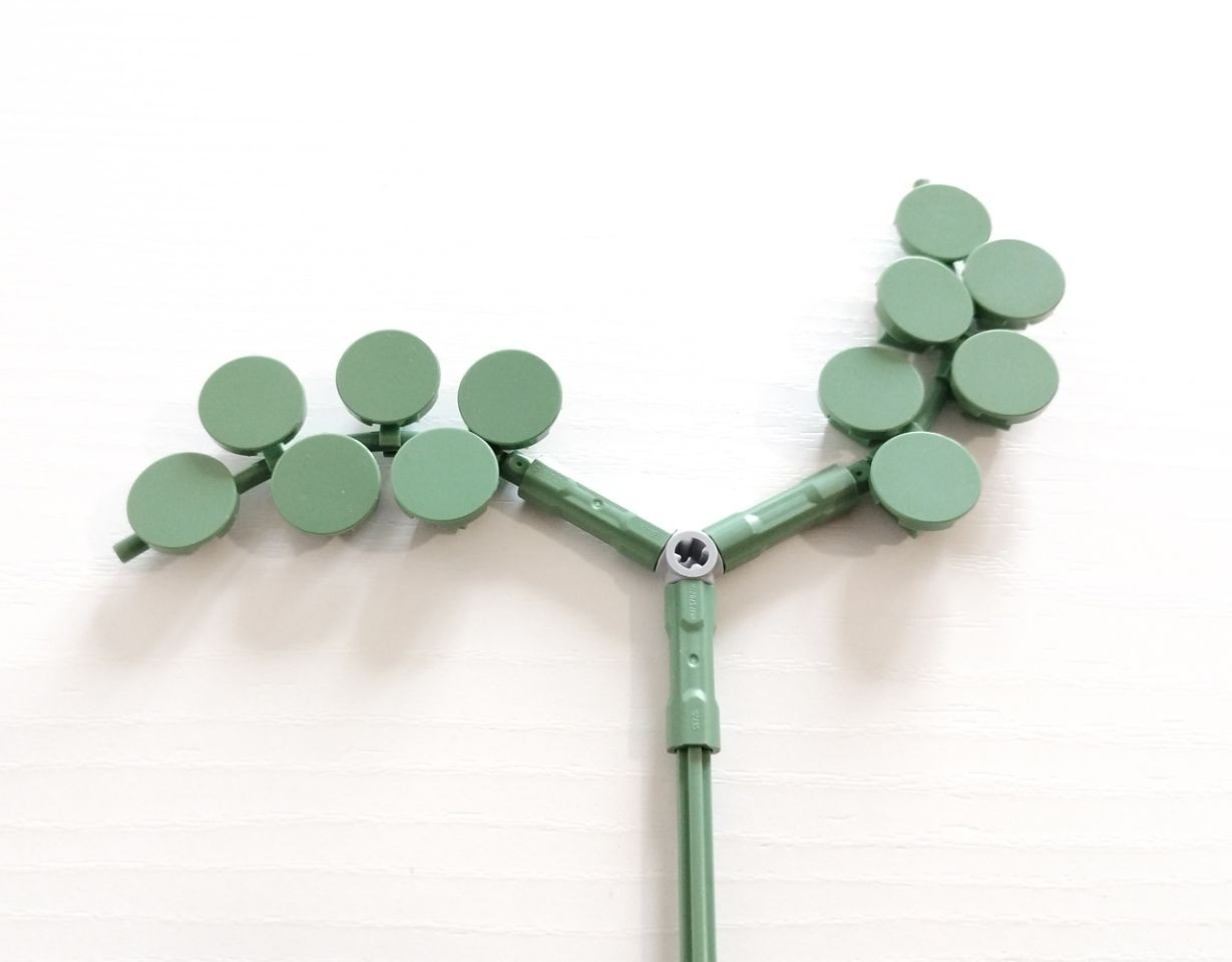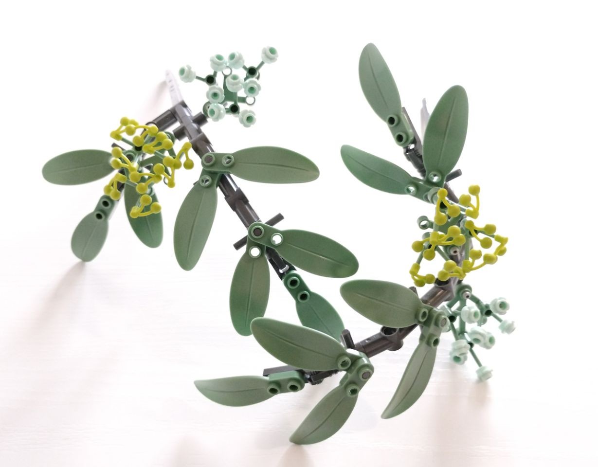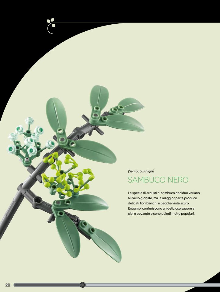 Pochi minuti e siamo già alla busta 2, con la quale realizzaremo due rami di "Sambuco Nero", un arbusto dai fiori bianchi, bacche viola e delicate foglie ovoidali, pianta molto usata per insaporire cibi e bevande. Per la costruzione dei due rami non verranno utilizzati gli axle 32l, bensì deiconnettori technic 2l di colore dark bluish gray (22 in tutto, 11 per ogni stelo). La parte alta del ramo ci presenta una inflorescenzadi boccioli realizzato con le classiche ciliegie verdi scala minifigure, mentre un'altra inflorescenza utilizza i tipici plate round 1x1 a forma di fiorellino in colore light aqua. Per le foglie di sambuco vengono utilizzate le recenti foglie "oblunghe" con plate round 1x2 all'estermità. Anche queste sono ricolorate in sand green apposta per la wave di gennaio dei nuovi set botanicle.