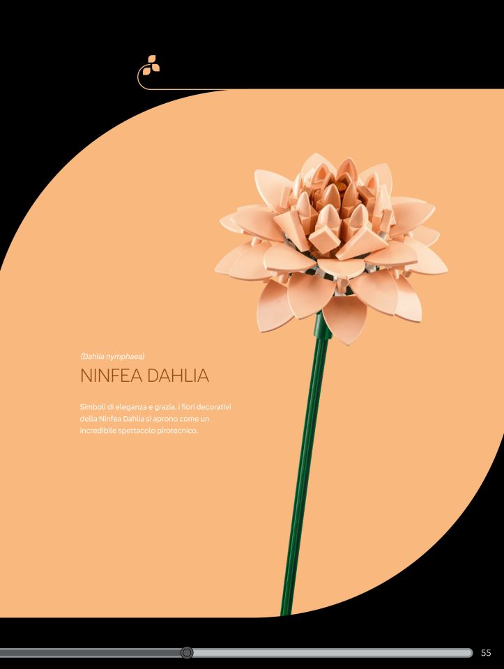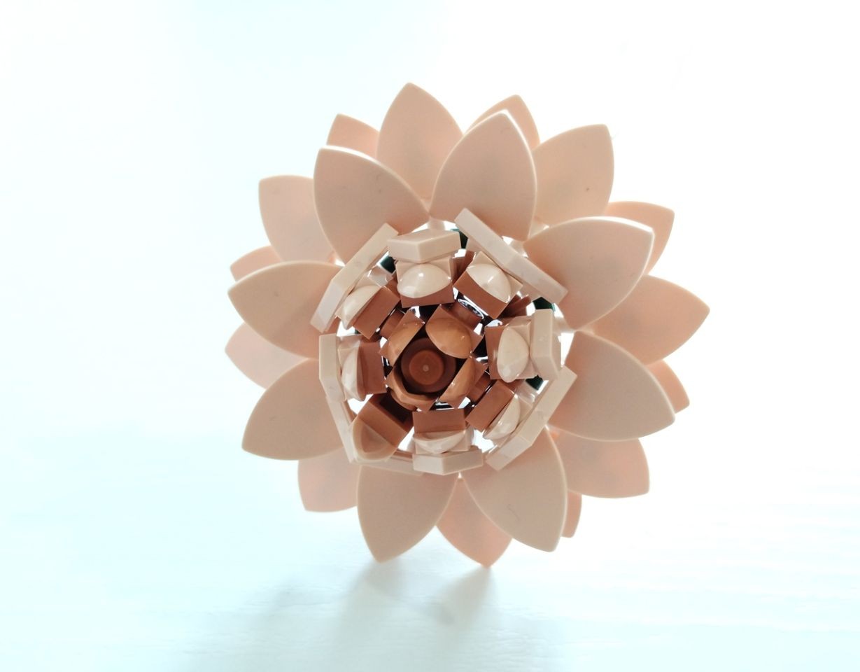 Sempre nella busta 5 troviamo anche una parte dei pezzi necessari a costruire il prossimo fiore: una "Ninfea Dahlia", fiore simbolo di eleganza e grazia, di un delicatissimo color light nougat. La costruzione ripropone in parte quella del ranuncolo, con il volante darck green a fare da supporto ed un susseguirsi di ben 24 petali realizzati con gli scudi (pezzo 3846) ricolorati in light nougat e tenuti in posizione da altrettante braccia di scheletro bianche. La parte sommitale del fiore è costruita con un sapiente alternarsi di tile e plate con dente (49668) disposti attorno ad un plate 2x2 con bar frame ottagonale. Lo stelo è anche qui un axle da 32l. Il risultato finale è incredibile, l'utilizzo degli scudi è un altro NPU di quelli che tanto ci piacciono.