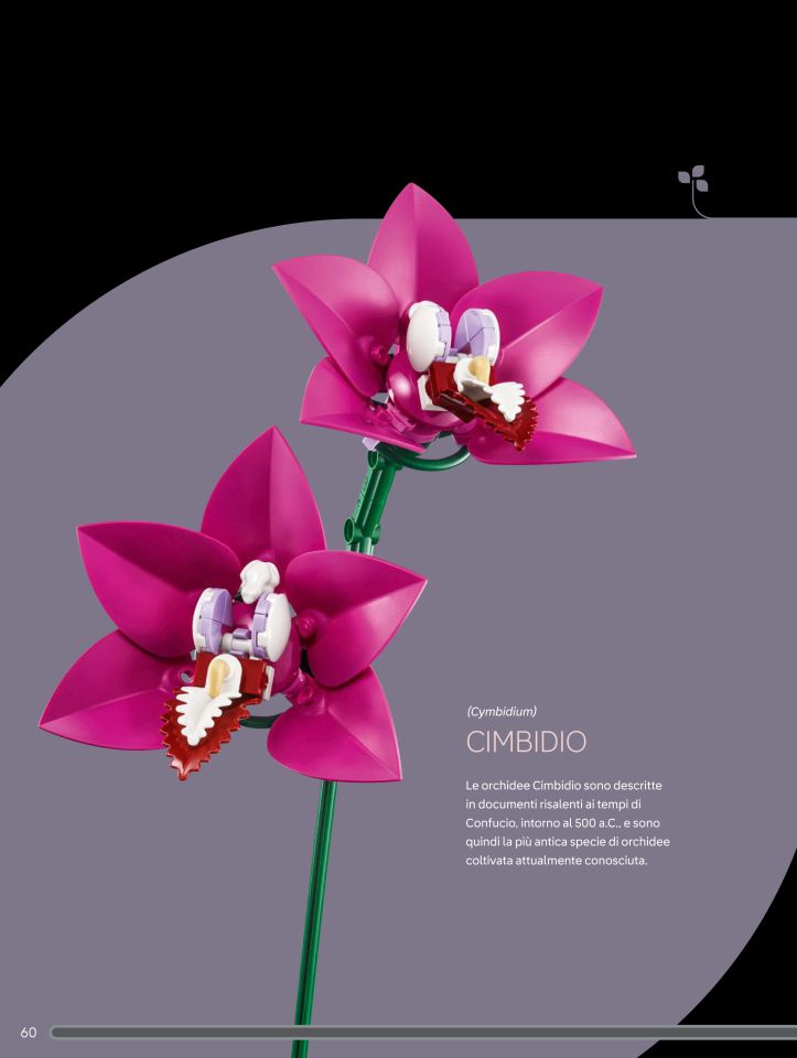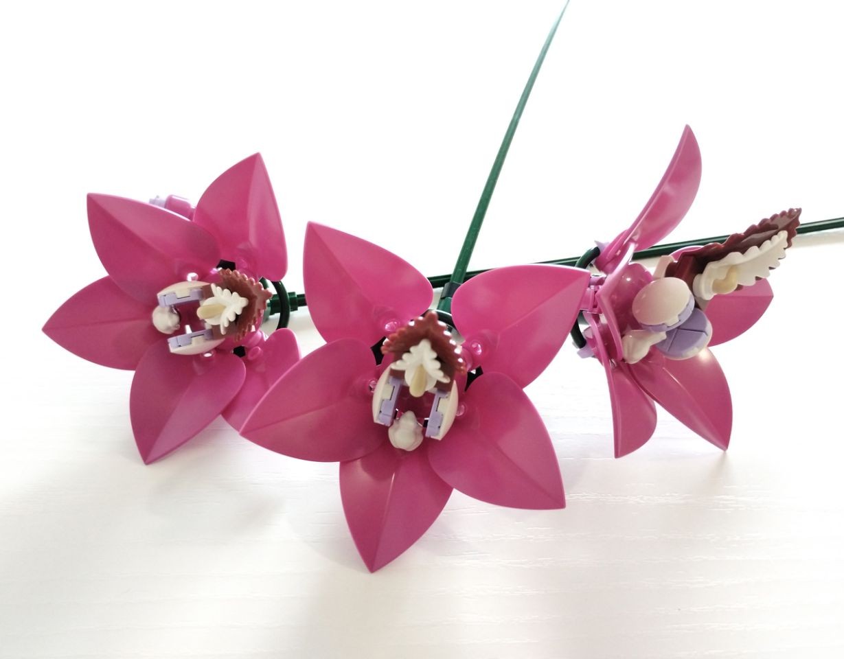 E siamo così arrivati all'ultima busta, la numero 6, con la quale costruiamo due rami di "Cimbidio", la più antica specie di orchidea della quale si ha documentazione scritta, risalente addirittura al 500 a.C. Iniziamo la costruzione con un altro volante dark green (alla fine conteremo ben 7 volanti, sicuramente il numero più alto di volanti mai inserito in un set) al quale vengono collegati dei bellissimi petali color magenta (pezzo 7096, presente in questo colore solo in questo set e che comunque vanta, al momento, solo altri 3 set botanicle in cui è presente, tutti del 2025). Inoltre torniamo a vedere delle rane (28841) utilizzate in un set botanical. Mentre nel set del bonsai (set 10281) venivano utilizzate delle rane rosa per rappresentare la fioritura della pianta, nel nostro Pink Flower Bouquet delle rane di colore bianco, congiuntamente a delle foglie di felcie doppie dark red (5151) e singole bianche (2682), oltre a dei corni curvi (64847), vengono utilizzate per rappresentare la parte centrale e gli stami del fiore. I due rametti di orchidea che realizziamo vedono in tutto la costruzione di tre orchidee, due su un ramo ed una più un bocciolo (realizzato con una testa di minifigure color magenta) sull'altro.