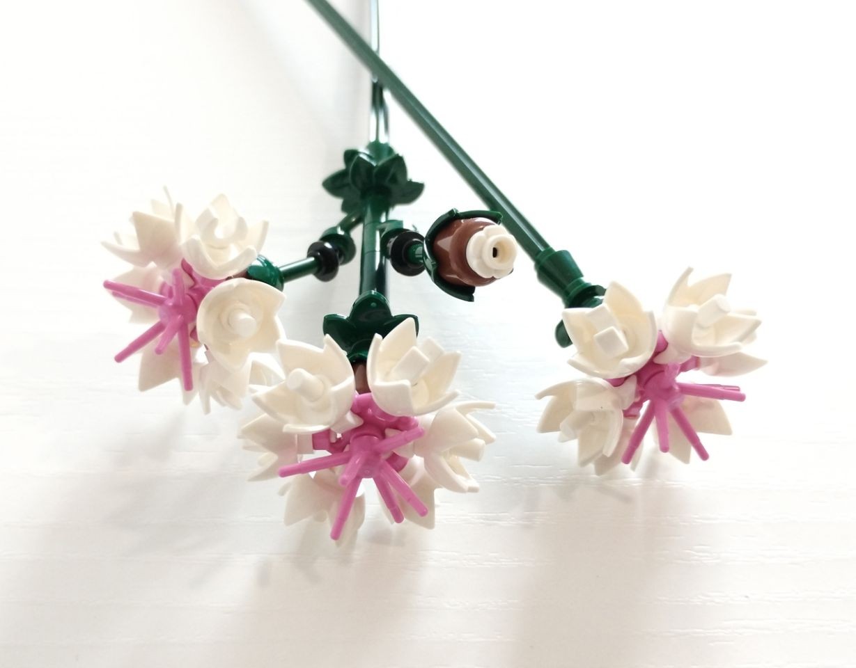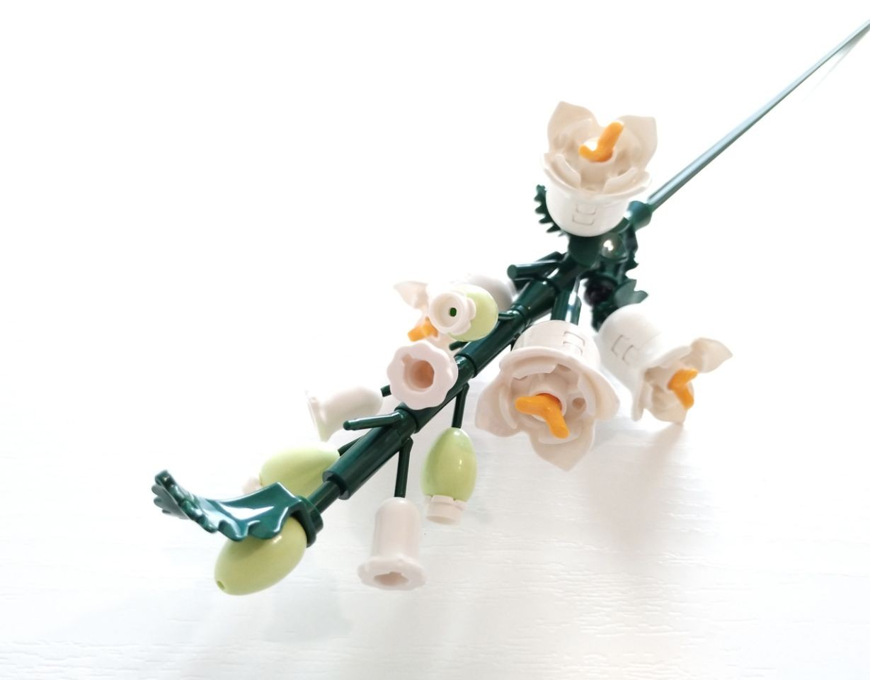 Si inizia con la campanula, realizzando una bella sequenza di "foglie di felce" (2682), brick round 1x1 con barre diagonali (6901) e candele (37762), tutto in colorazione dark green. Le campanule bianche in piena fioritura, molto semplici ma efficaci, fanno uso del brick round 2x2 con petali (15469) e del rametto (33183) in bright light orange a rappresentare gli stami del fiore, mentre per i fiori piccoli vengono utilizzati i nuovi pezzi "fiore campanula" (pezzo 6017, pure questo del 2025). Per i boccioli, infine, abbiamo il pezzo "uovo" (24946) in yellowish green. Lo stelo è realizzato con l'axle da 32l in dark green, ed è possibile allungarlo con dei connettori technich sempre in dark green.