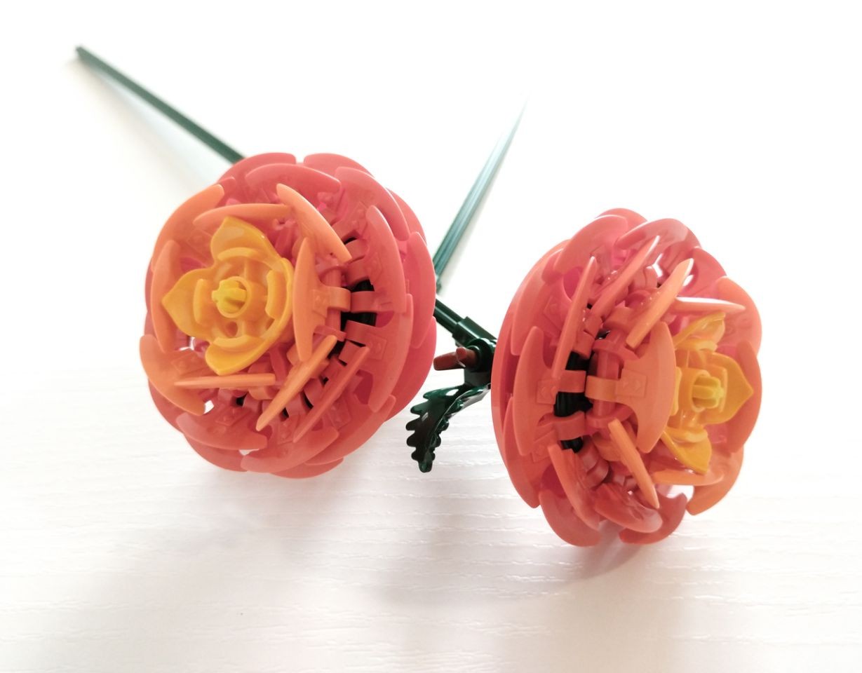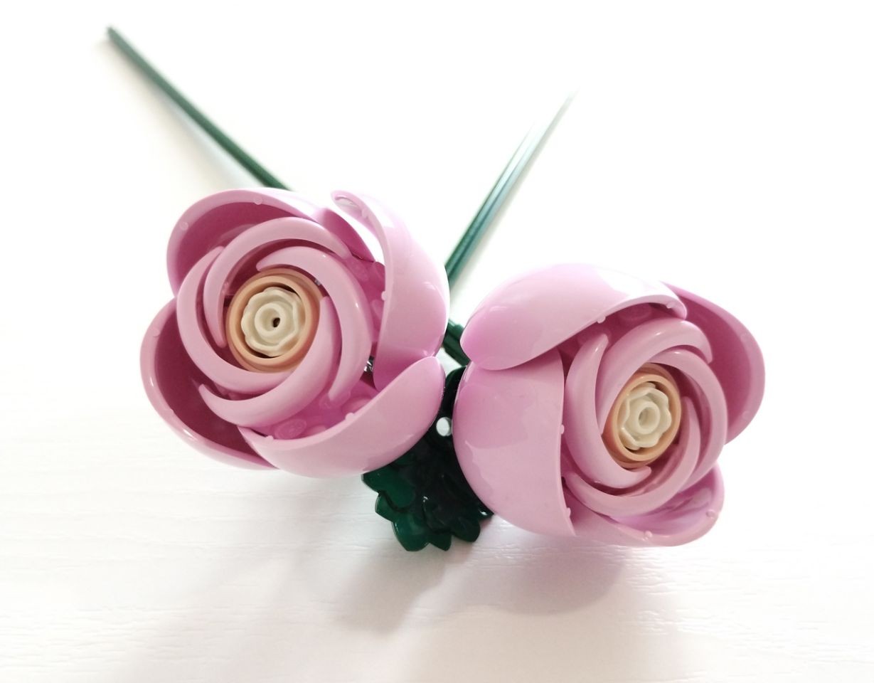 Le rose di questo set sono praticamente identiche ad una delle tre tipologie di rose rosse che si possono costruire con il set "Bouquet di Rose" (set 10328). Le differenze sono solo nel colore, qui in rosa, e nella parte centrale del fiore, dato che in questo set viene usato l'item 5904, il pezzo che rappresenta le peonie, introdotto per la prima volta nel set "The Botanical Garden" (set 21353) del 2024. Le due rose che costruiamo si differenziano solo per l'inclinazione, uno dei due rami utiizza un connettore technic "inclinazione 3" in più, e in uno dei due steli sono presenti le spine (corni/denti 53451), mentre nell'altro una foglia (pezzo 5058).