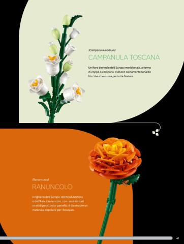 Il "Ranuncolo" è il primo fiore davvero sorprendente di questo set. Un insieme di dischi 6x6 reddish orange, volanti dark green e plate 2x2 con bar frame ottagonale reddish orange, tenuti insieme da un axle technic. Il "colpo di genio" sta nei petali, un vero e proprio NPU (Nice Part Usage), dato che per rappresentare i petali i designer hanno deciso di usare il pezzo che normalmente rappresenta le asce (pezzo 53454). Nel set ne troviamo ben 44 in reddish orange e 16 in orange (robe che nemmeno nei più grandi set Castle o Viking s'era mai vista), che andranno pazientemente disposte attorno al volante ed al frame ottagonale. Il centro del fiore è realizzato con brick round 2x2 con petali (15469) in bright light orange. Anche qui gli steli sono fatti con gli axle 32x dark green e connettori technic dello stesso colore. Il risultato è bellissimo.