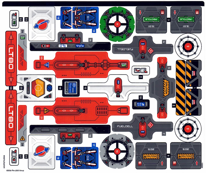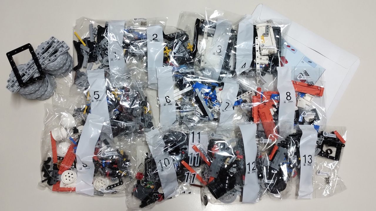 All'interno del box troviamo 13 buste numerate (i sacchetti sono ancora quelli di plastica), tre frame technic non imbustati, così come le sei bellissime ruote in light bluish gray, ed il manuale di istruzioni con un foglio di adesivi contenuti in un box di cartone a parte. Il manuale non ha nessuna parte introduttiva relativa al rover e si conclude con una serie di immagini del modello completo (le stesse del box) e dei set technic "Space" disponibili a catalogo, oltre all'immancabile lista dei pezzi. Saranno in tutto 296 le pagine da sfogliare e 418 i passaggi da affrontare per terminare il modello. Gli adesivi da applicare saranno in tutto 42, certamente tanti, ma tutto sommato più semplici da applicare rispetto ai 46 del set 42181 "Astronave Heavy Cargo VTOL LT81".