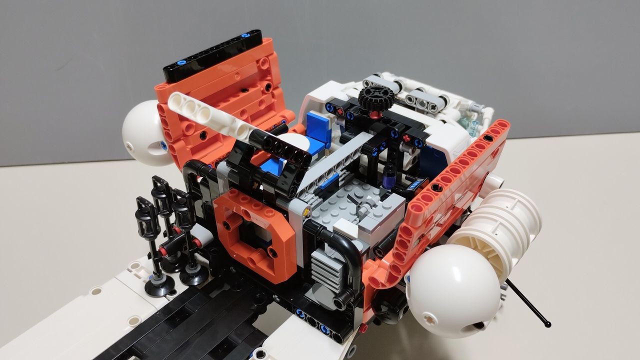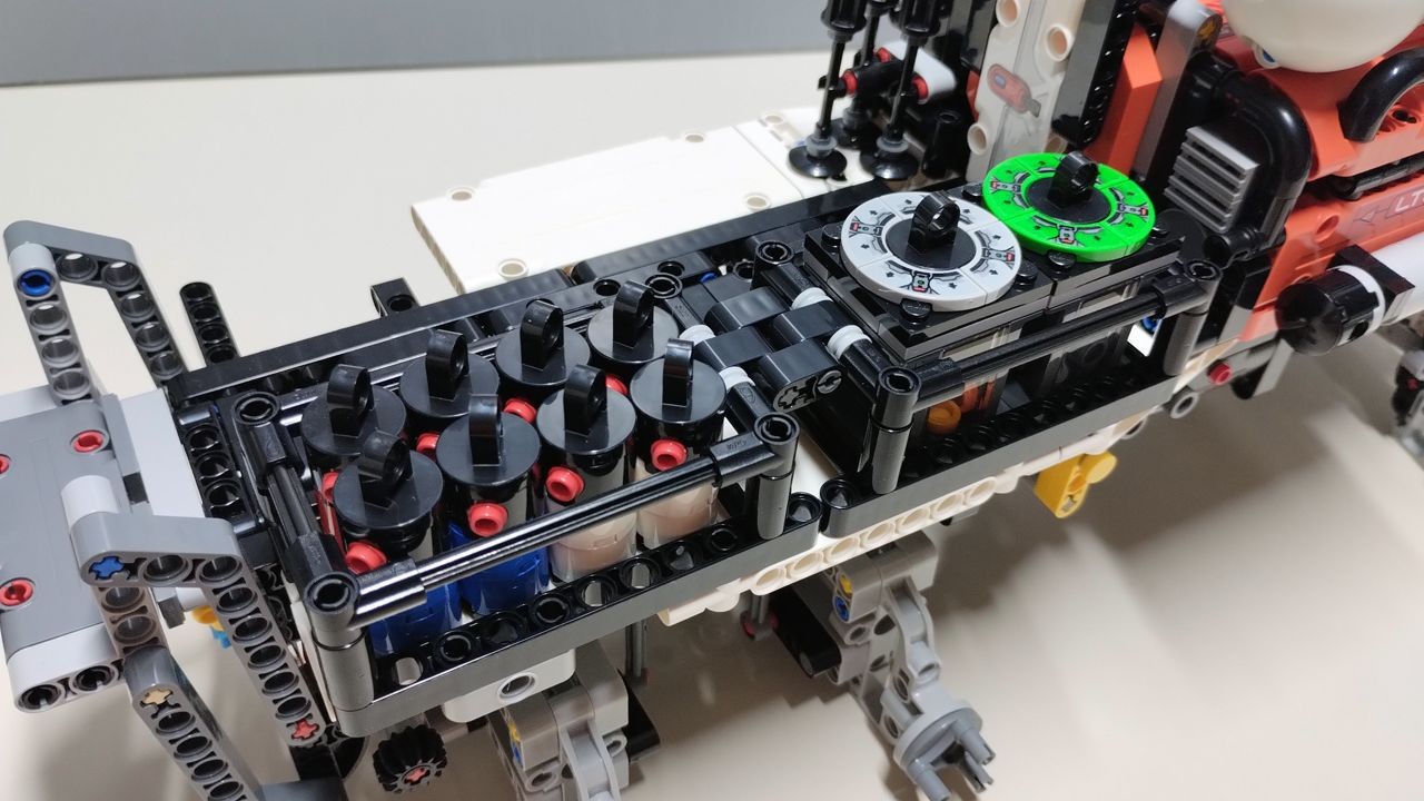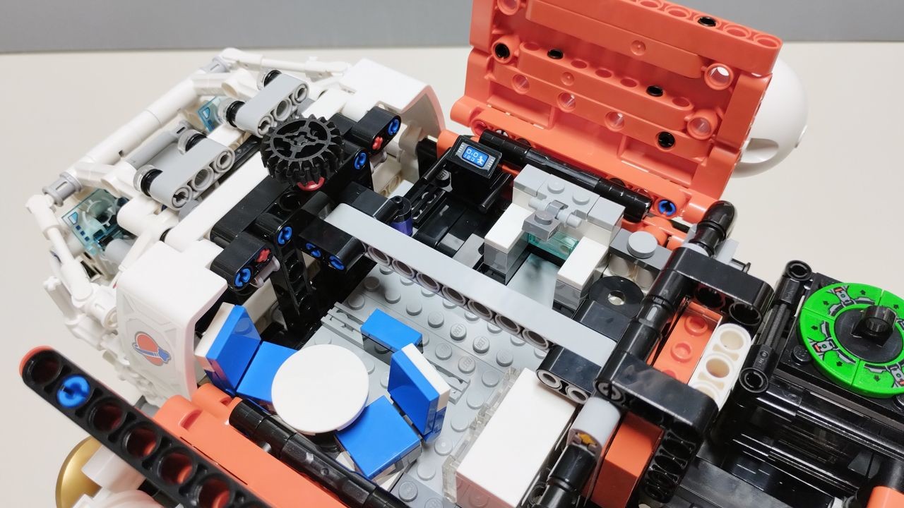 Abbiamo ormai dato fondo a metà delle buste a nostra disposizione e procediamo spediti con le buste 8 e 9, con le quali completeremo la costruzione della porzione anteriore del rover. Subito dietro la cabina di guida, infatti, costruiremo un volume realizzato in pannelli nella nuova colorazione "reddish orange" introdotta proprio con questa nuova wave di set "Space". I pannelli sono decorati con sticker ed abbelliti con alcune costruzioni aggiuntive, come diverse antenne radio e dei cilindri posti di lato e sulla sommità dei pannelli. Questi ultimi, in colore bianco, sono caratterizzati dall'introduzione dell'unico pezzo esclusivo per questo set, ovvero il pezzo codice 4412 "Cylinder Hemisphere 5 x 5" in colore bianco (quattro pezzi in tutto presenti nel set). La parte superiore dei pannelli in reddish orange è apribile, ed al suo interno sono ospitate alcune attrezzature interamente costruite in mattoncini "classici". In particolare da un lato abbiamo un piccolo bagno, quella che sembrerebbe una doccia (ma non ci giurerei e non ho trovato altre informazioni in merito) ed un tapis roulant. Dall'altro lato abbiamo un paio di contenitori con portella trasparente ed un tavolino con due sedie girevoli. Molto azzeccata l'idea degli sticker da applicare su dei tile 1x2 bianchi, che rappresentano i cibi leofilizzati. Questa cellula si conclude con un portellone apribile posto sul retro, con il pezzo "airlock" che permette di connettere questa parte del rover ad altri moduli presenti in altri set della serie.