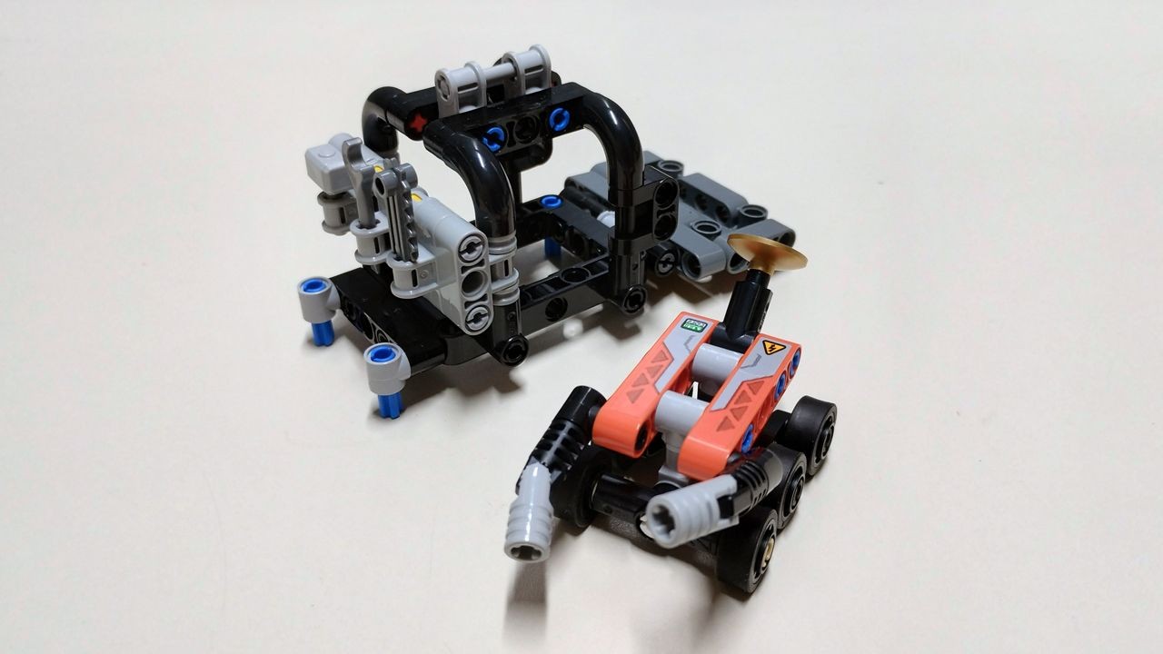 La prossima fase costruttiva prevede l'utilizzo delle buste 3, 4 e 5. Al termine avremo costruito tutta la parte inferiore del rover comprensiva dell'asse anteriore con ruote sterzanti ed il pianale di carico del rover stesso. Alla fine di questa seconda fase di costruzione potremo già apprezzare la funzione forse più interessante di tutto il set. Infatti una delle particolarità di questo modello è che la sua lunghezza è "modificabile". Facendo scorrere le due parti costruite fino ad ora una dentro l'altra si va a modificare la lunghezza del rover che così può avere due configurazioni, una "aperta" con il pianale di carico pronto ad ospitare tutte le attrezzature di cui il rover è dotato (ci torniamo dopo), ed una "chiusa", con tutti gli accessori scaricati al suolo ed un aspetto del rover decisamente più compatto. La tenuta in posizione estesa del rover è garantita dall'utilizzo di due semplici perni in giallo, ben riconoscibili nella color scheme finale del set.