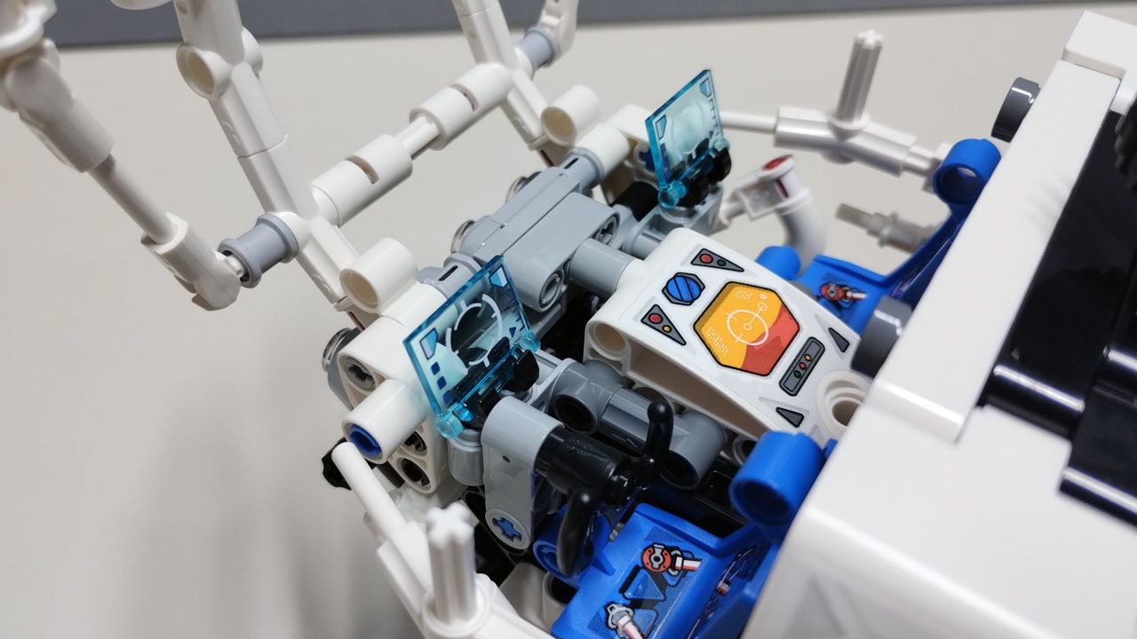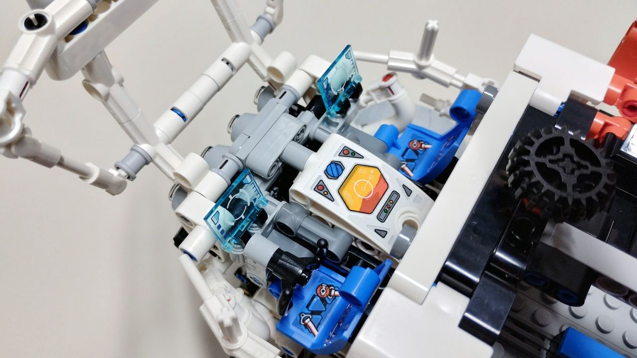 Passiamo adesso alla realizzazione della cabina di guida del rover, per la cui costruzione sarà necessario utilizzare le buste numero 6 e 7. La cabina è principalmente realizzata con connettori e bar di colore bianco, con alcuni inserti in light bluish gray come i fari anteriori e quelli posti sopra la cabina, ed i sedili in blu. All'interno della cabina troviamo due postazioni di guida, una per il pilota ed una per il copilota, divise da una console centrale bianca decorata con uno sticker. Da segnalare l'utilizzo di due "utensil book cover" in trans light blue, utilizzati come pannelli di controllo dei due piloti e già presenti in altri otto set della serie "Space". I sedili di guida sono decorati con doppio sticker che rappresentano le cinture di sicurezza. Anche questo set, come gli altri due già recensiti, permette di "ospitare" delle minifigure. Certo la scala del Rover è notevole, sia rispetto all'astronave "Heavy Cargo LT81" che al piccolo "Loader Spaziale LT78" e le minifigure, nella "realtà", avrebbero bisogno di un jetpack per salire a bordo, ma resta il fatto che aggiungere delle minifigure ad un set dà sempre quel tocco in più…
