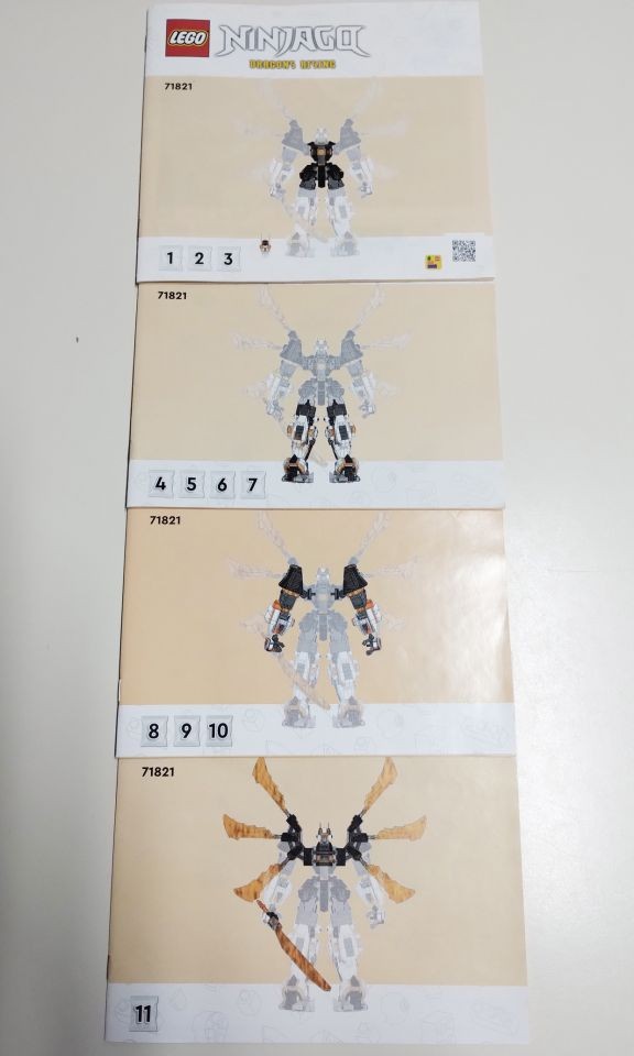 All'interno del box troviamo 11 buste numerate, una busta non numerata con i pezzi necessari per costruire le ali di cui è dotato il mech, il pezzo utilizzato per la katana (senza nessun sacchetto protettivo) e la confezione di cartone contenente le istruzioni ed un foglio di adesivi. I sacchetti contenenti i pezzi sono ancora quelli di plastica. Per le ali verranno utilizzati sei pezzi "codice 2144", ovvero una lama seghettata in colore pearl gold, già comparsa in altri 7 set della linea ninjago dal 2023 ad oggi. Invece per l'arma principale del mech, una bellissima e lunghissima katana, verrà utilizzato il pezzo "codice 5240", cioè lo stesso introdotto ed utilizzato per le pale del set 10327 (Atreides Royal Ornithopter), ricolorato in pearl gold esclusivamente per questo set. All'interno della confezione di cartone che contiene le istruzioni e gli adesivi troviamo 4 libretti di istruzioni distinti ed un foglietto con soli 12 adesivi (poteva andare molto ma molto peggio). Interessante che le istruzioni siano state suddivise in quattro blocchi distinti, ciò dà la possibilità di montare il set in più persone contemporaneamente rendendo l'esperienza di costruzione un'attività condivisa. Ed infatti io mi sono divertito a costruirlo insieme ai miei bambini. Brava Lego, ottima scelta.