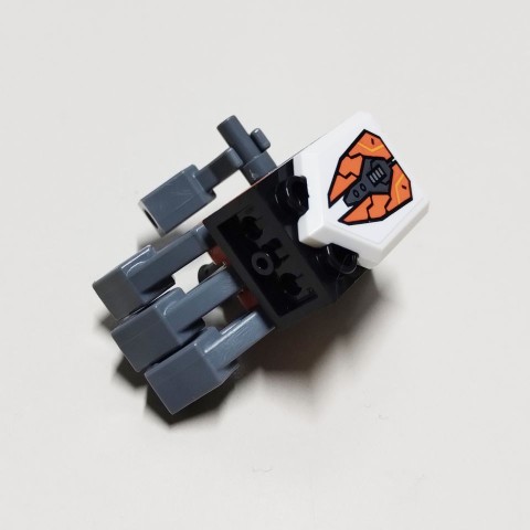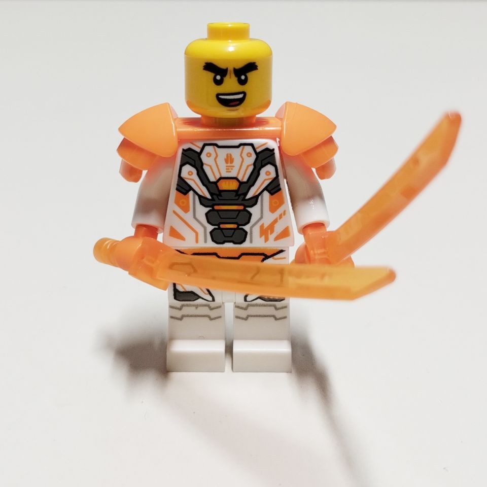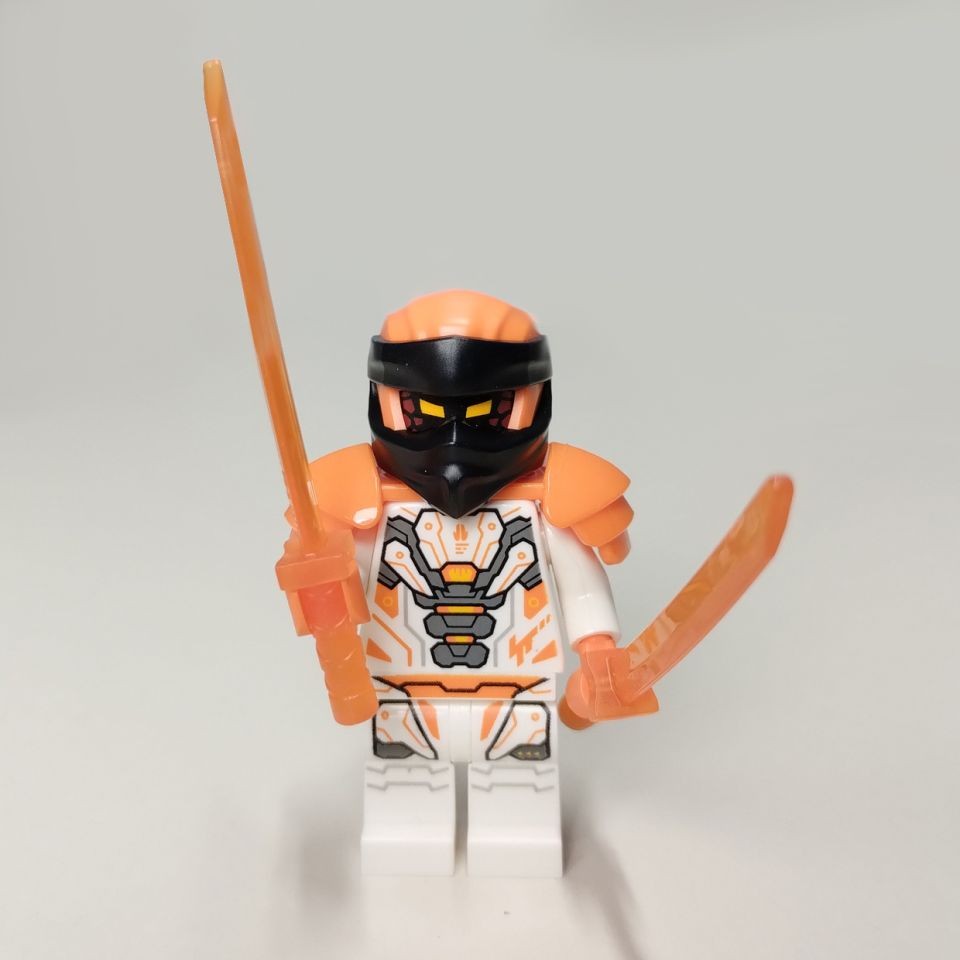 Il primissimo step è la costruzione dell'unica minifigure presente nel set. Ovviamente si tratta della minifigure del ninja Cole, esclusiva per questo modello. Cole abbandona il suo tradizionale abito nero e veste una nuova divisa, bianca con inserti arancioni e grigio scuri. Il torso è stampato fronte/retro, le gambe sono stampate solo sul davanti. La minifigure è dotata di spalline e mani arancioni e due katane in colore trans orange. La testa è anch'essa stampata con due espressioni. Da un lato Cole ha un cipiglio spavaldo, con le sue grosse sopracciglia nere che spadroneggiano, dall'altro lato ha la maschera da combattimento calata sul viso. A completare la minifigure c'è un copricapo dual molded in arancione e nero. Il copricapo, la testa e le spalline sono già stati utilizzati in almeno un altro set prima di questo, mentre torso e gambe fanno qui la loro prima e, fin ora, unica apparizione.