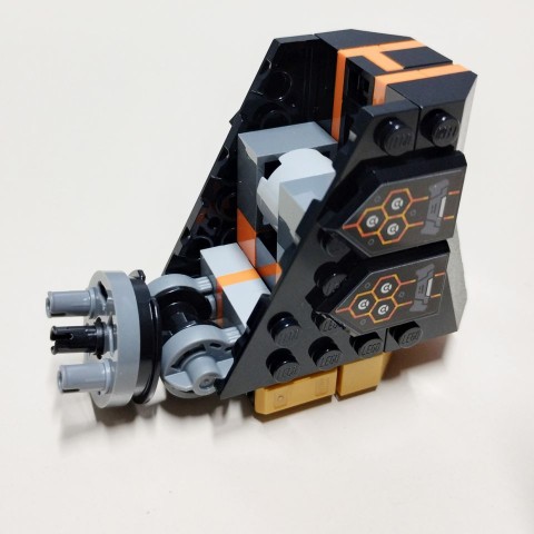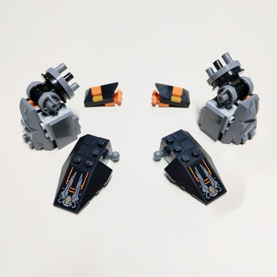 Alcune considerazioni ed alcune cose interessanti da segnalare su questa fase di montaggio. La prima è l'utilizzo, sotto ai piedi, di sei pin gommati per ogni piede (pezzo "codice 24375") che servono ad aumentare il grip tra il modello e la superficie di appoggio, migliorandone la stabilità. La seconda è l'utilizzo di ben quattro pistoni (due per ogni piede), posizionati immediatamente dietro l'articolazione della caviglia. Attraverso un sapiente uso di ball joint questi pistoni, connessi alla parte intermedia della gamba, permettono di tenere ben saldi i piedi nella posizione che decideremo di dare al mech. Terzo, che io sappia questo è il primo mech che dispone di un'articolazione del ginocchio completa. Vengono utilizzati ben tre Axle Connector 2 x 3 with Ball Joint Socket per la rotazione del ginocchio (pezzo "codice 67695", introdotto nella sua prima versione all'epoca dei Bionicle, ed ancora abbondantemente usato un po' ovunque, nella sua versione migliorata, data la sua estrema duttilità). La seconda articolazione del ginocchio, a "scorrimento" tra la parte superiore e quella inferiore della gamba ha una doppia funzione veramente ingegnosa. Da un lato consente di aumentare il grip, e quindi la tenuta, tra le due parti della gamba, ed in seconda battuta va a mascherare l'ingombrante meccanismo di rotazione del ginocchio, aggiungendo qualità estetica a quella parte del modello. Quarto, per tutte le porzioni della gamba si fa abbondante uso di SNOT. La conseguenza è che chiaramente non c'è lato della gamba che non sia particolarmente dettagliato, il che è sicuramente un valore aggiunto a tutto l'insieme.