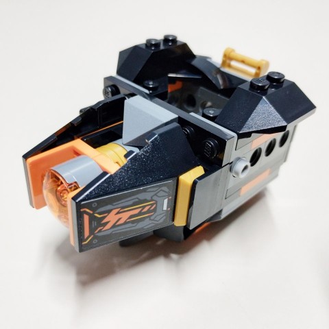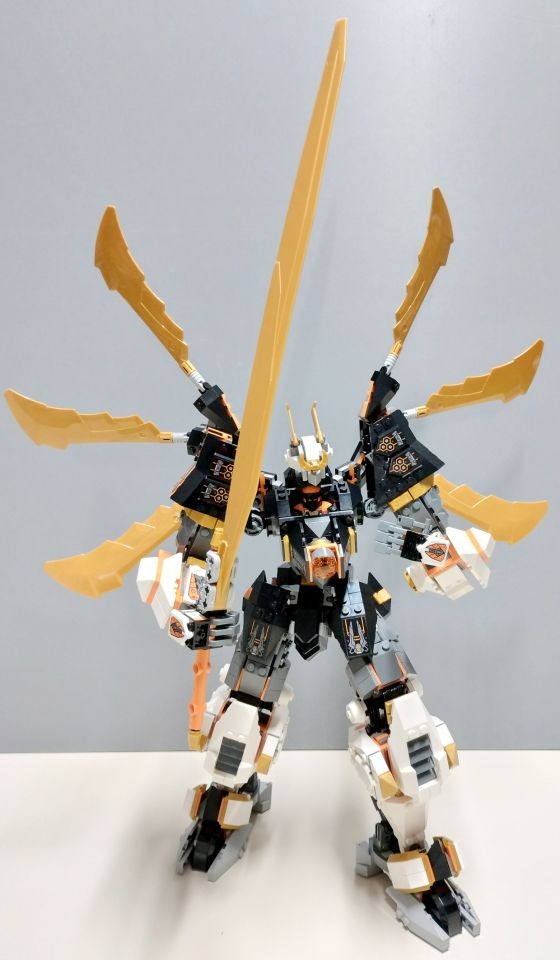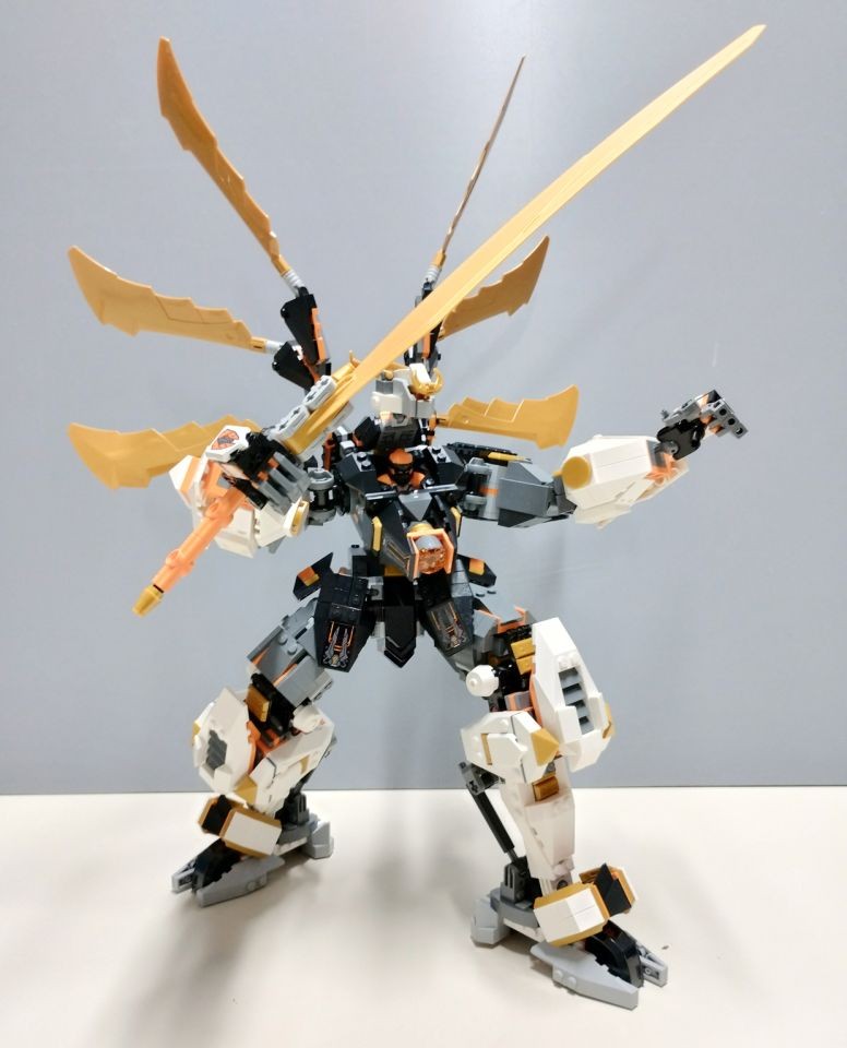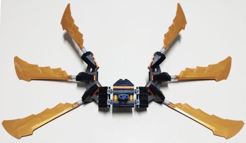 La busta 11 contiene il necessario per costruire, in quest'ordine, la testa, le ali e la katana. La testa è formata da due parti: il collo, che fa anche da protezione (parziale) all'alloggiamento per la minifigure di Cole, ricavato nella parte alta del torso del mech, e la testa vera e propria, montata su un ball joint in modo che anche essa possa essere orientata praticamente ovunque. Poi passiamo alle ali. Si inizia con una sorta di jet pack che si connette alla schiena del mech. A questo sono collegati due parti ripiegabili alle quali sono ulteriormente collegate le sei lame seghettate citate all'inizio della recensione. Anche le sei lame sono a loro volta orientabili, di modo che anche le ali possano assumere diverse configurazioni. Siamo agli sgoccioli. L'ultimo step è la costruzione della katana. Un'elsa realizzata con diversi connettori technic fa da sostegno all'incredibile lama, lunga ben 32 cm, scelta per questo set. Sono necessari tre axle di lunghezza 2l per tenere in posizione la lama e l'elsa. Come immaginato, al centro dell'elsa c'è un foro che consente di connettere la spada ad uno dei pin liberi in entrambe le mani del mech.