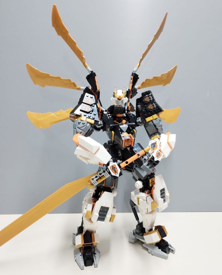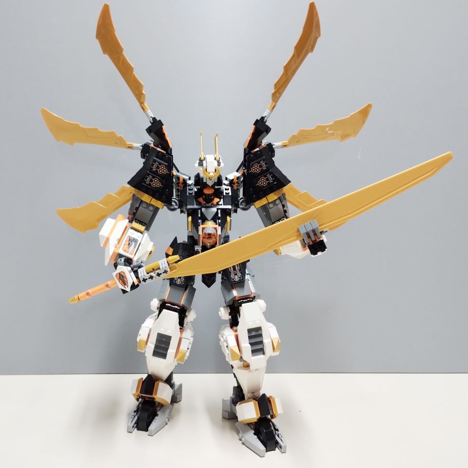 Partiamo dalle dimensioni del set… Il modello finito ha dimensioni notevoli, misura oltre 45 cm di altezza dalla superficie di appoggio alla punta più alta delle ali, 33 cm se invece prendiamo in considerazione la testa come punto più alto del mech. E' largo poco meno di 38 cm e la lama della katana è lunga ben 32 cm (40 cm considerando tutta l'arma, compresa l'elsa). Per cercare di rendere al meglio l'idea delle dimensioni del set ho misurato un paio di modelli che ho in casa… Voltron (set 21311 del 2018) è alto 43 cm, Yoda (set 75255 del 2019) è alto 40 cm dai piedi alla punta della spada laser. Insomma, il 71821 ha una presenza "scenica" notevole, ovunque voi decidiate di posizionarlo, ed è sicuramente un avversario più che temibile per qualsiasi villain del tema Ninjago.