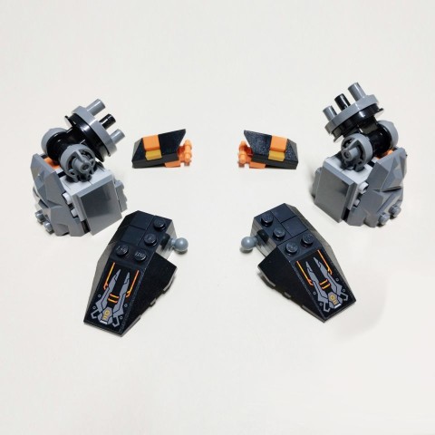 Siamo così arrivati alla terza fase della costruzione. Prendiamo il terzo libretto di istruzione, i sacchetti da 8 a 10, e procediamo a costruire le braccia. Ogni sacchetto contiene la parte destra e la parte sinistra di una delle tre sezioni in cui sono suddivise le braccia. Con il sacchetto numero 8 costruiamo le imponenti spalle del mech. Interessante la tecnica che consente di invertire il verso di costruzione attraverso l'utilizzo di brick technic con pin e fori, e l'utilizzo di un axle per tenere i mattoncini in posizione. Dopo questo passaggio "strutturale", con l'utilizzo di brick wedge e plate wedge si andrà a dare solidità e tenuta a tutta la porzione che stiamo costruendo. Le spalle si completano con gli ultimi due technic rotation joint con doppio pin che si collegano alla parte alta del torso. Apriamo la busta 9 e in pochi passaggi realizziamo la parte centrale delle braccia. Da sottolineare che l'articolazione a livello del gomito è doppia, cosa che permetterà all'avambraccio di poter effettuare un ampio movimento fino a toccare la spalla, senza rimanere bloccato a 90° o poco più come succede in altri mech precedenti. Il Pin di giunzione tra spalla e braccio consente, come nelle gambe, la completa rotazione del braccio stesso, un altro assist alla grande varietà di movimenti possibili per le parti anatomiche del mech. Ci attende la busta numero 10. Altro uso di bracket per costruire su tutti i lati dell'avambraccio, ed anche in questo caso non sono molti i passaggi da effettuare prima di giungere al termine. Concludiamo la fase tre con la realizzazione delle mani. Il pollice purtroppo non è orientabile, ma credo che possiamo farcene tranquillamente una ragione… All'interno dei palmi è presente un pin libero al quale, sicuramente, sarà possibile collegare la spada del mech.
