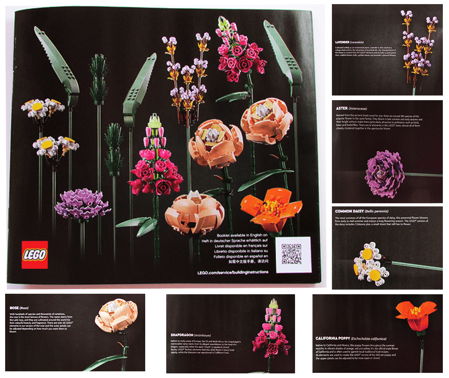 Le istruzioni sono piccole, stampate su carta nera che è bellissima ed elegante nonchè adatta alla grafica dei set 18+, ma secondo me può creare problemi con la lettura di pezzi scuri (tipo Dark green o Reddish brown). L'inizio è dedicato ad una descrizione sintetica di ogni fiore contenuto nel bouquet oltre alla pagina dedicata ai designer, mentre troviamo sparse all'interno tante piccole notizie dedicate ai singoli elementi:per esempio dove è già stato utilizzato un pezzo, come viene comunemente utilizzato, notizie su un colore particolare, ecc.