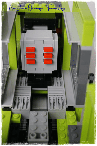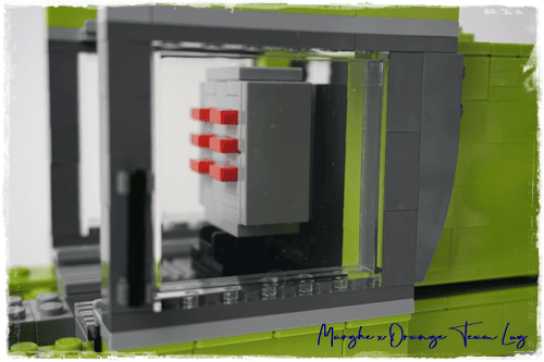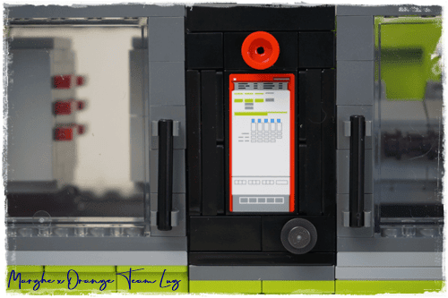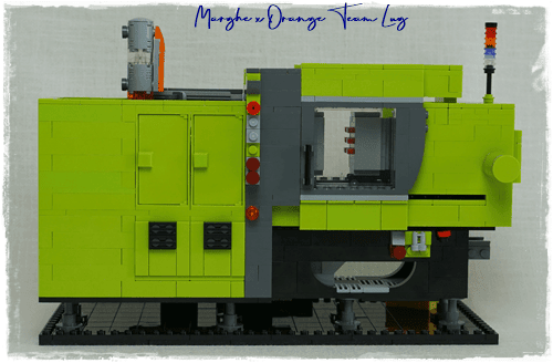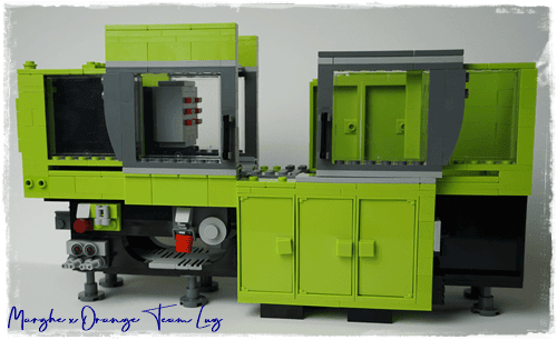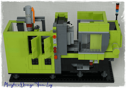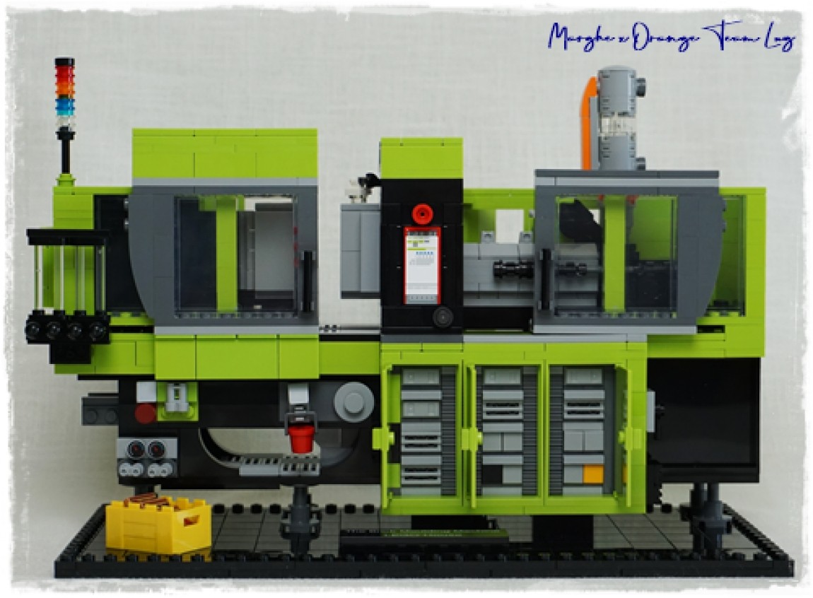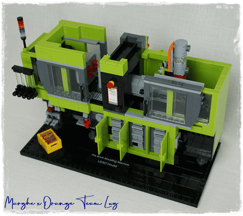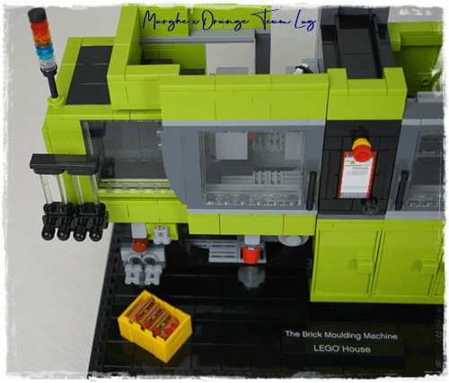 Questa macchina la si può vedere in reale al piano terra di LEGO® HOUSE. Collegata al seminterrato da cui prende i granuli di ABS rossi necessari allo stampaggio, la macchina produce brick 2×4, da qui i minuscoli elementi rossi che si vedono nello stampo di questo set.