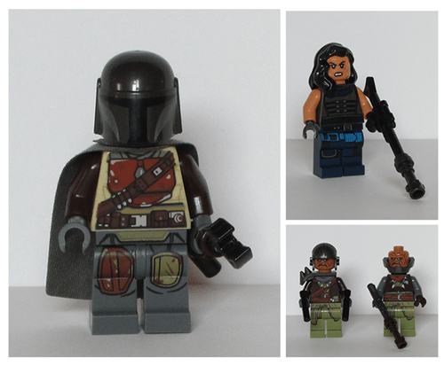 - il mitico Mando, quasi certamente la minifig più ambita del set, con una armatura dettagliata e la particolarità del mantello più stretto dei normali mantelli LEGO® che replica fedelmente l'abbigliamento del personaggio televisivo. Il casco è particolarmente dettagliato e la testa della minifig è nera, giusto per mantenere l'identità misteriosa del protagonista; abbastanza dettagliato il blaster con le doppie punte ma senza un calcio adeguato.