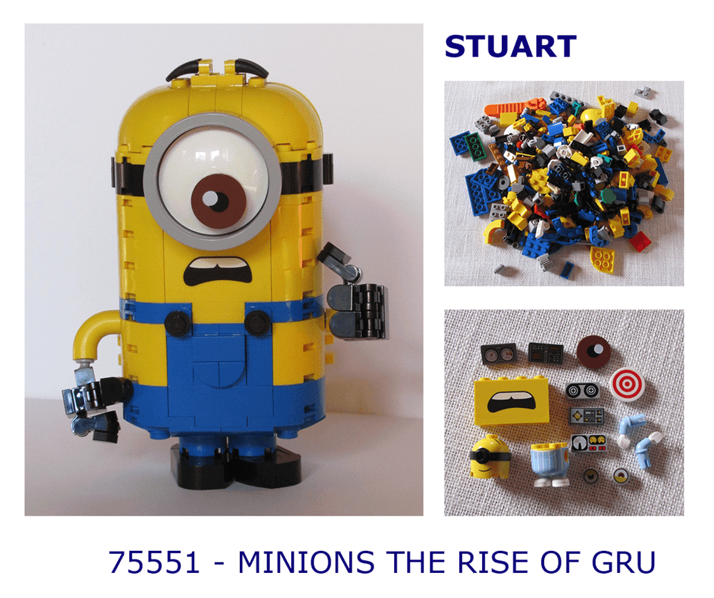 Nella busta 1 troviamo tutto il necessario per costruire Stuart in versione grande e la sua controparte in versione minifig vestita per una notte di sonno. L'esterno della costruzione è molto liscio, un unico occhio, due scarpe che tengono ben diritto Stuart. Ma aprendo la parte posteriore si scopre la sua camera da letto, con un letto ribaltabile a scomparsa, le freccette, lo stereo, un boomerang ... e il brick round 2x2 che permette di muovere il suo unico occhio. Quando il letto scompare rimane lo spazio per alloggiare la sua versione minifig.