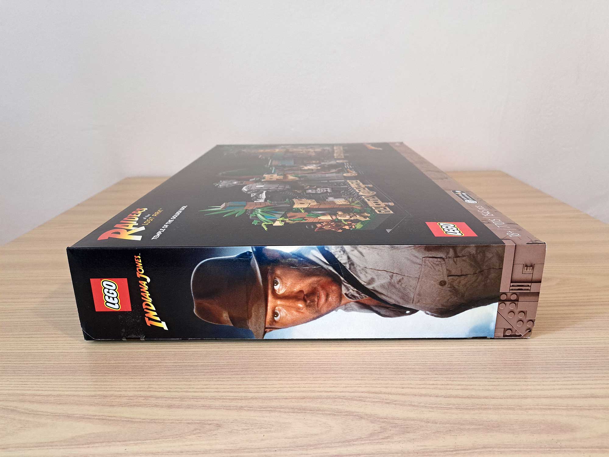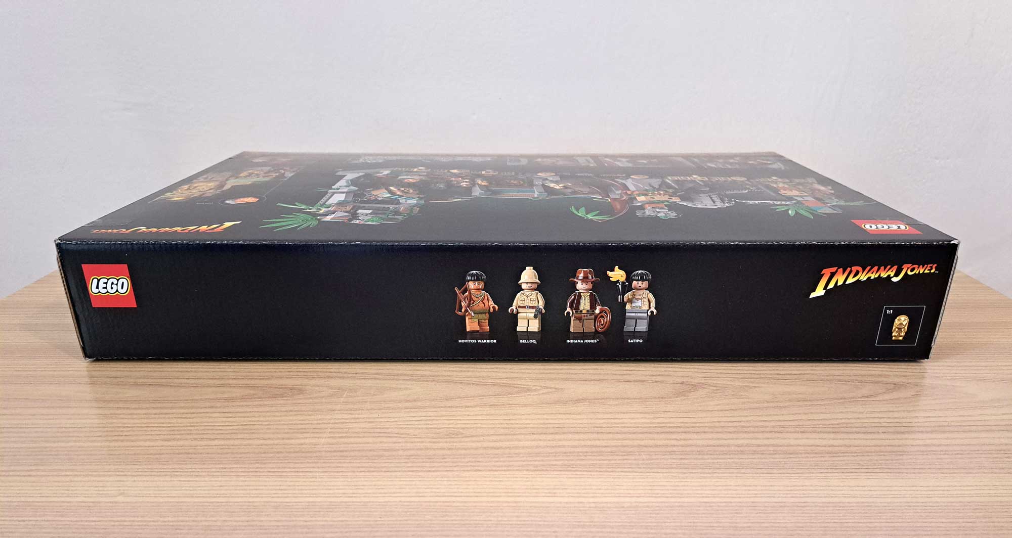 Sul retro ritroviamo il tempio da un’altra angolatura, circondato da vari riquadri con immagini dei dettagli, il disegno stilizzato del set, il mattoncino luminoso e la scena iconica del film col protagonista al cospetto dell’Idolo d’oro della fertilità. Nei lati ritroviamo da una parte un’immagine di Harrison Ford e sopra le minifigure presenti: un guerriero Hovitos, il perfido Belloq, Indiana Jones e la guida locale Satipo.
